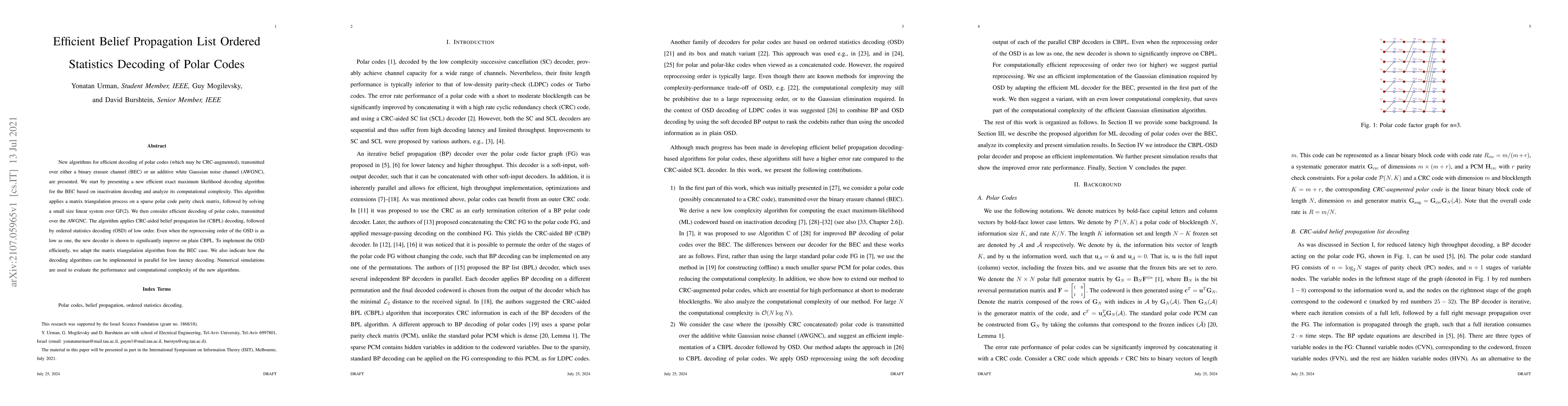 This paper introduces efficient decoding algorithms for polar codes over BEC and AWGNC, including an inactivation decoding method for BEC and a CRC-aided belief propagation list ordered statistics decoding for AWGNC, demonstrating significant performance improvements and parallelizable implementation.