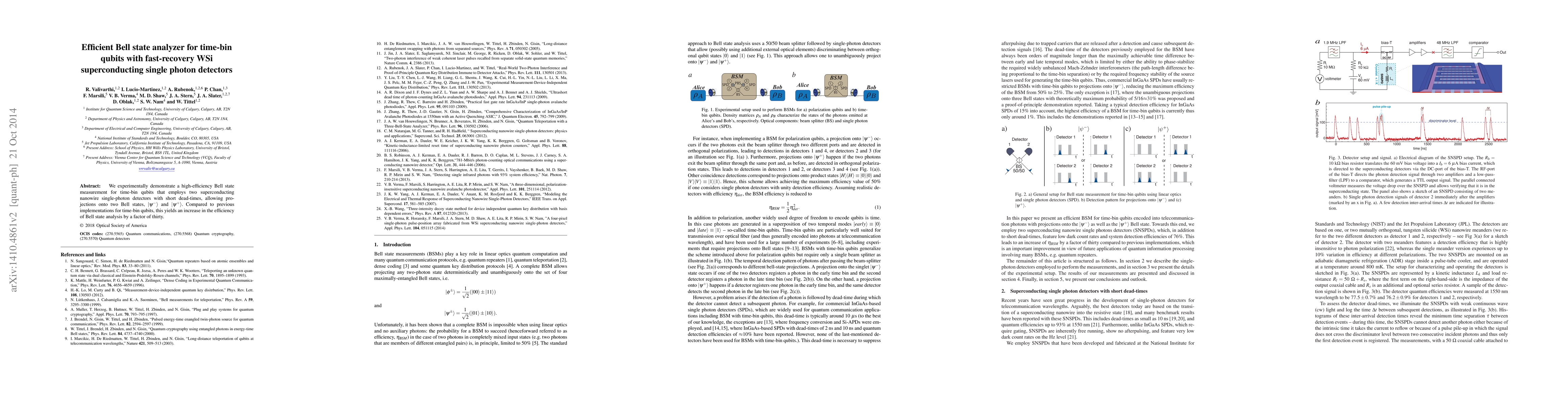 The paper presents an efficient Bell state analyzer for time-bin qubits using fast-recovery superconducting single photon detectors, significantly increasing Bell state measurement efficiency by a factor of thirty compared to previous implementations.
