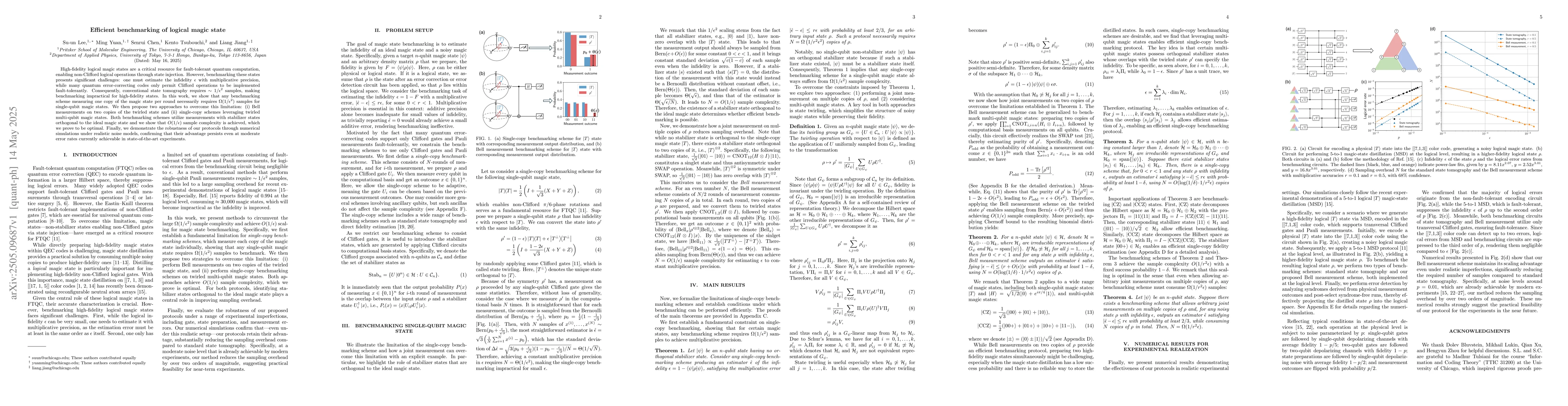 This research is crucial for fault-tolerant quantum computation as it presents efficient methods for benchmarking high-fidelity logical magic states, a critical resource for non-Clifford operations, overcoming the limitations of conventional state tomography.