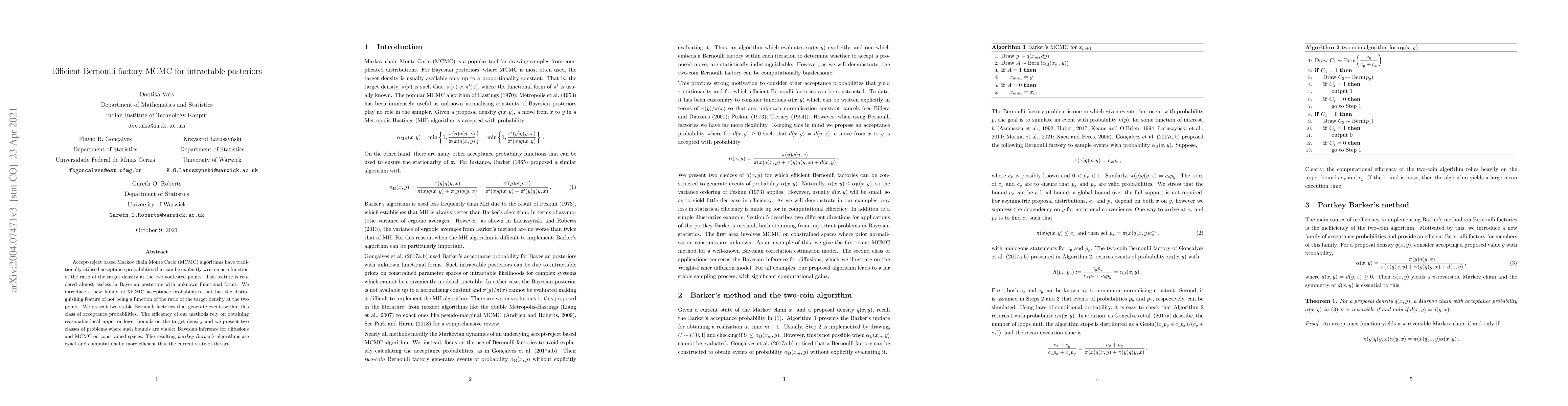 This paper introduces a new MCMC method for intractable posteriors that uses Bernoulli factories to generate acceptance probabilities independent of the target density ratio. The proposed algorithms are exact and more efficient for Bayesian inference in diffusions and constrained spaces.