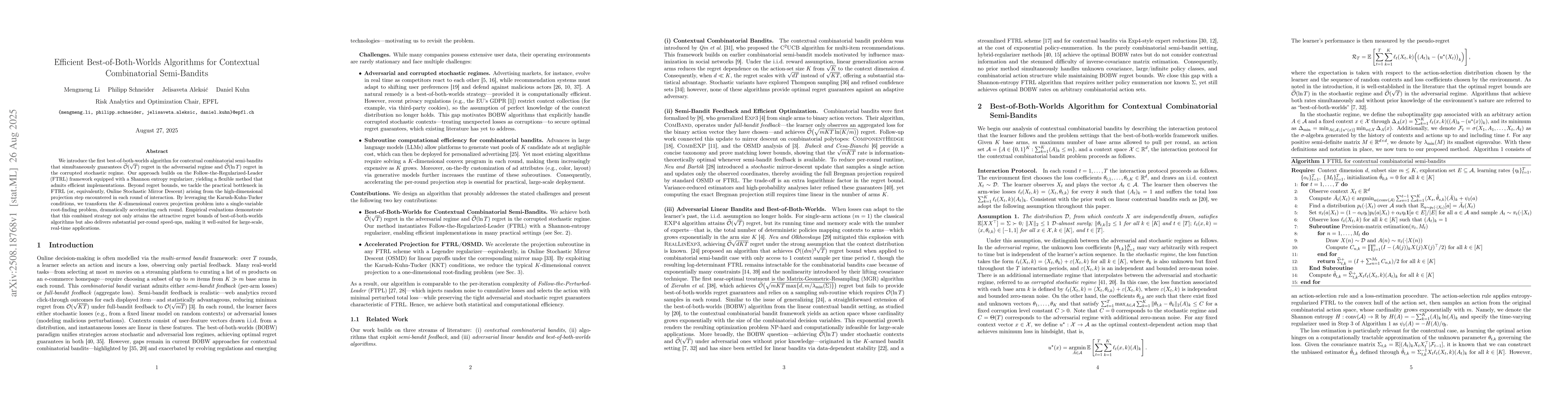 We introduce the first best-of-both-worlds algorithm for contextual combinatorial semi-bandits that simultaneously guarantees $\widetilde{\mathcal{O}}(\sqrt{T})$ regret in the adversarial regime and $\widetilde{\mathcal{O}}(\ln T)$ regret in the corrupted stochastic regime. Our approach builds on the Follow-the-Regularized-Leader (FTRL) framework equipped with a Shannon entropy regularizer, yielding a flexible method that admits efficient implementations. Beyond regret bounds, we tackle the practical bottleneck in FTRL (or, equivalently, Online Stochastic Mirror Descent) arising from the high-dimensional projection step encountered in each round of interaction. By leveraging the Karush-Kuhn-Tucker conditions, we transform the $K$-dimensional convex projection problem into a single-variable root-finding problem, dramatically accelerating each round. Empirical evaluations demonstrate that this combined strategy not only attains the attractive regret bounds of best-of-both-worlds algorithms but also delivers substantial per-round speed-ups, making it well-suited for large-scale, real-time applications.