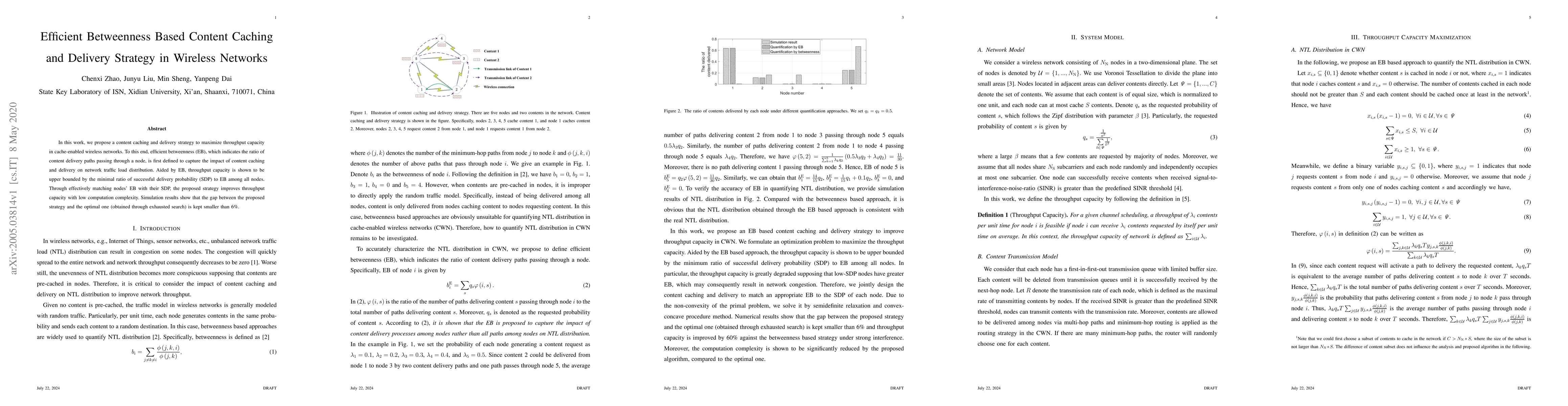 This paper proposes a content caching and delivery strategy in wireless networks that maximizes throughput by defining efficient betweenness (EB) to optimize traffic load distribution. The strategy matches nodes' EB with their delivery probability to enhance throughput with minimal computational complexity, achieving less than 6% gap to optimal performance.