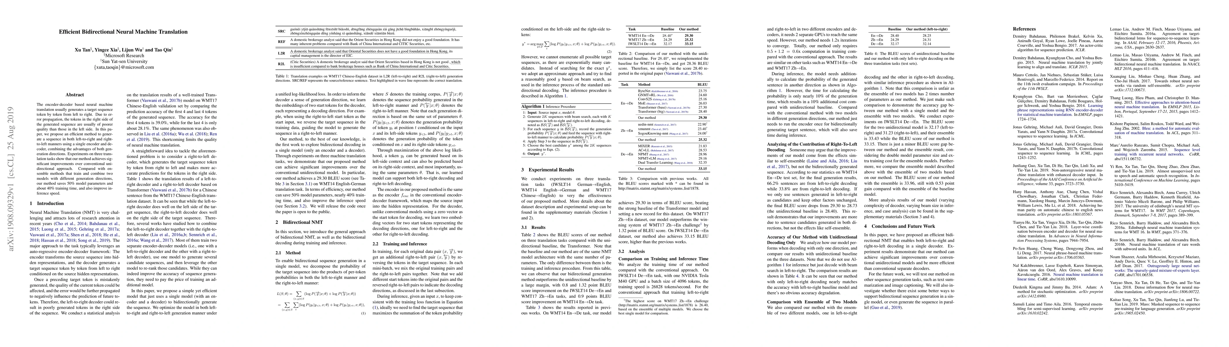 This paper proposes an efficient bidirectional neural machine translation method that generates sequences both left-to-right and right-to-left using a single encoder-decoder, achieving better translation quality and significant improvements over conventional unidirectional methods. The approach saves 50% model parameters and 40% training time while also enhancing inference speed.
