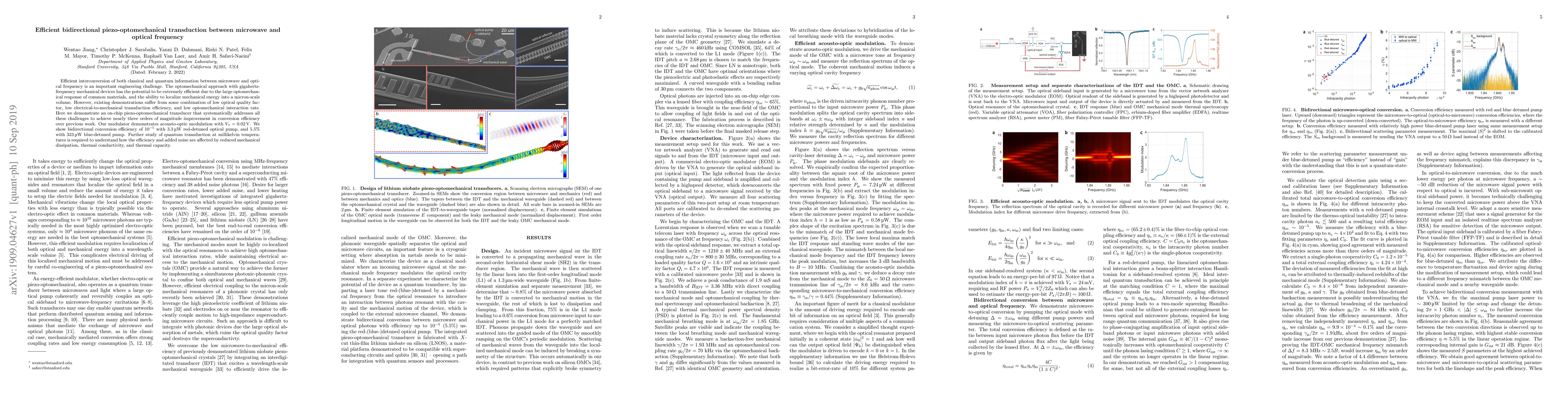 This paper presents an on-chip piezo-optomechanical transducer that significantly enhances the efficiency of bidirectional conversion between microwave and optical frequencies, achieving a three-order-of-magnitude improvement over previous methods. The demonstrated device shows high conversion efficiency and acousto-optic modulation at low voltages, paving the way for future quantum transduction studies.