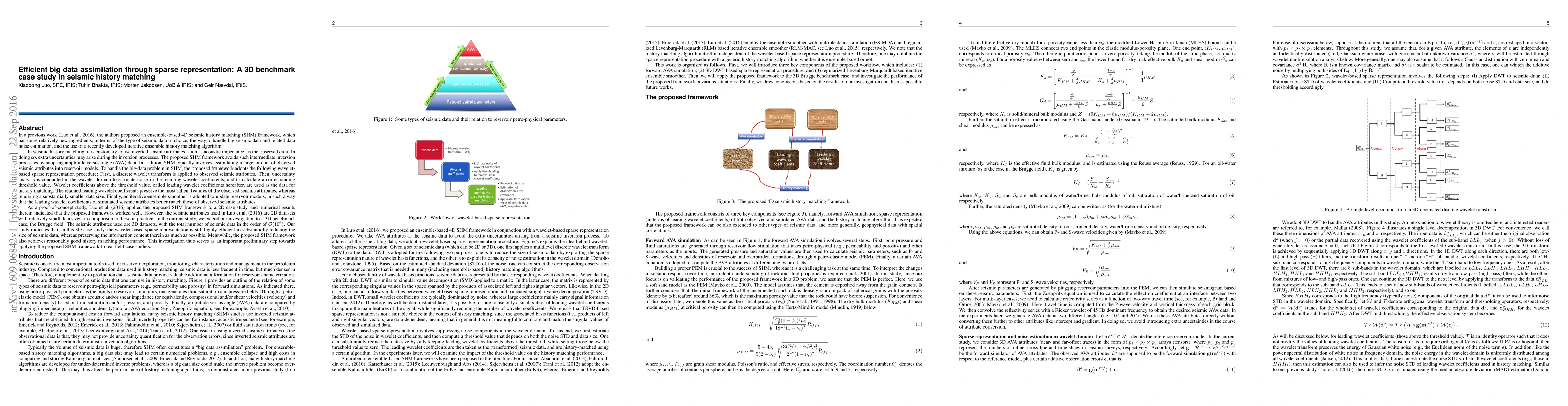 In a previous work \citep{luo2016sparse2d_spej}, the authors proposed an ensemble-based 4D seismic history matching (SHM) framework, which has some relatively new ingredients, in terms of the type of seismic data in choice, the way to handle big seismic data and related data noise estimation, and the use of a recently developed iterative ensemble history matching algorithm. In seismic history matching, it is customary to use inverted seismic attributes, such as acoustic impedance, as the observed data. In doing so, extra uncertainties may arise during the inversion processes. The proposed SHM framework avoids such intermediate inversion processes by adopting amplitude versus angle (AVA) data. In addition, SHM typically involves assimilating a large amount of observed seismic attributes into reservoir models. To handle the big-data problem in SHM, the proposed framework adopts the following wavelet-based sparse representation procedure: First, a discrete wavelet transform is applied to observed seismic attributes. Then, uncertainty analysis is conducted in the wavelet domain to estimate noise in the resulting wavelet coefficients, and to calculate a corresponding threshold value. Wavelet coefficients above the threshold value, called leading wavelet coefficients hereafter, are used as the data for history matching. The retained leading wavelet coefficients preserve the most salient features of the observed seismic attributes, whereas rendering a substantially smaller data size. Finally, an iterative ensemble smoother is adopted to update reservoir models, in such a way that the leading wavelet coefficients of simulated seismic attributes better match those of observed seismic attributes. (The rest of the abstract was omitted for the length restriction.)