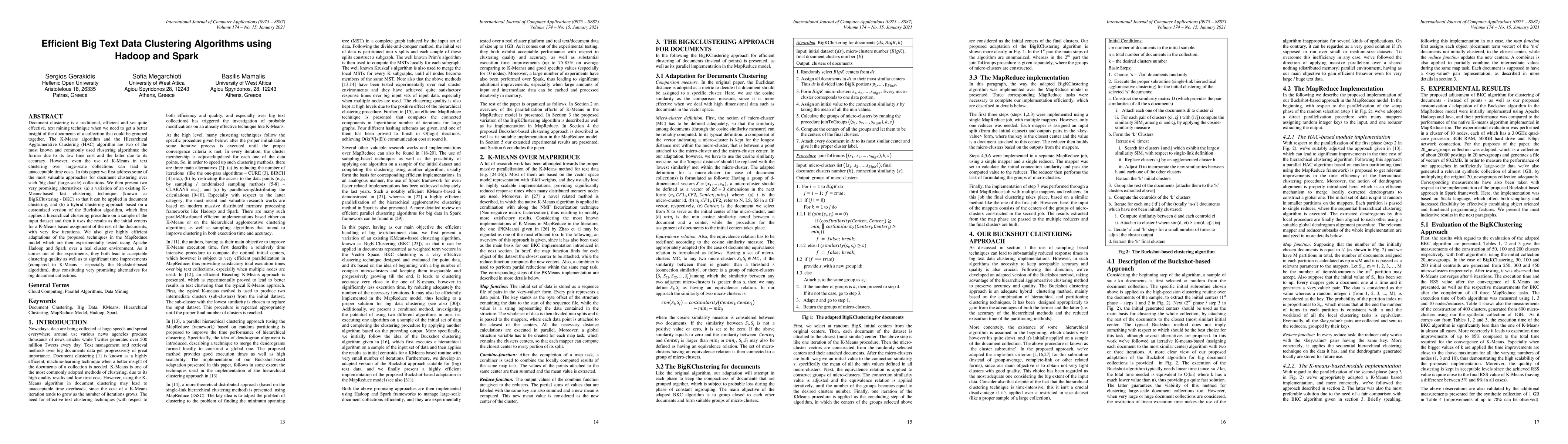 Document clustering is a traditional, efficient and yet quite effective, text mining technique when we need to get a better insight of the documents of a collection that could be grouped together. The K-Means algorithm and the Hierarchical Agglomerative Clustering (HAC) algorithm are two of the most known and commonly used clustering algorithms; the former due to its low time cost and the latter due to its accuracy. However, even the use of K-Means in text clustering over large-scale collections can lead to unacceptable time costs. In this paper we first address some of the most valuable approaches for document clustering over such 'big data' (large-scale) collections. We then present two very promising alternatives: (a) a variation of an existing K-Means-based fast clustering technique (known as BigKClustering - BKC) so that it can be applied in document clustering, and (b) a hybrid clustering approach based on a customized version of the Buckshot algorithm, which first applies a hierarchical clustering procedure on a sample of the input dataset and then it uses the results as the initial centers for a K-Means based assignment of the rest of the documents, with very few iterations. We also give highly efficient adaptations of the proposed techniques in the MapReduce model which are then experimentally tested using Apache Hadoop and Spark over a real cluster environment. As it comes out of the experiments, they both lead to acceptable clustering quality as well as to significant time improvements (compared to K-Means - especially the Buckshot-based algorithm), thus constituting very promising alternatives for big document collections.