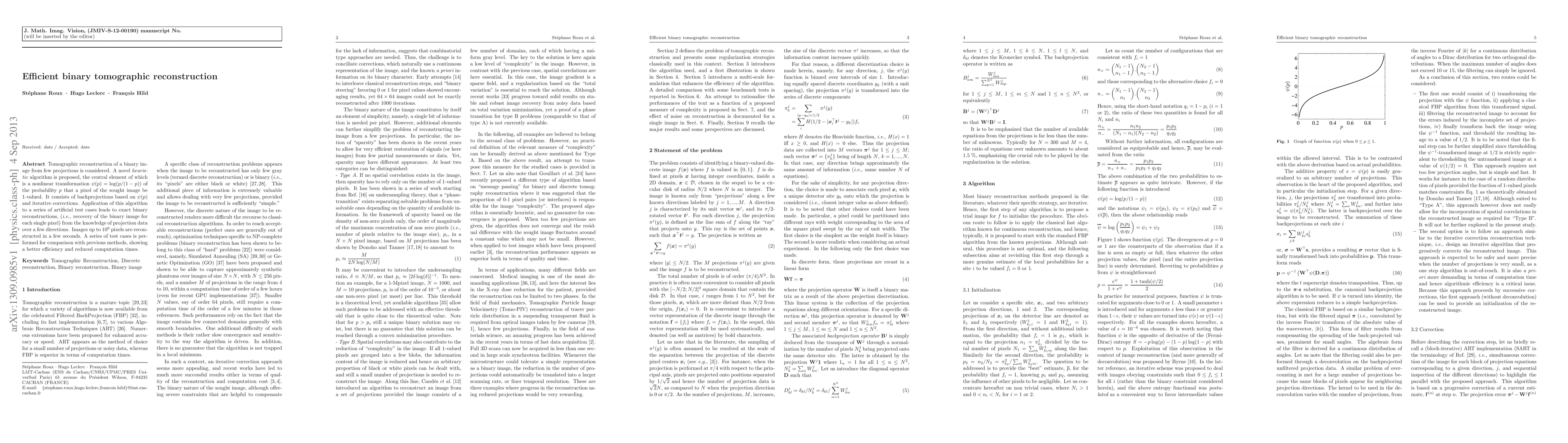 A novel algorithm efficiently reconstructs binary images from few projections, achieving exact reconstructions in a few seconds for images up to 1 million pixels.
