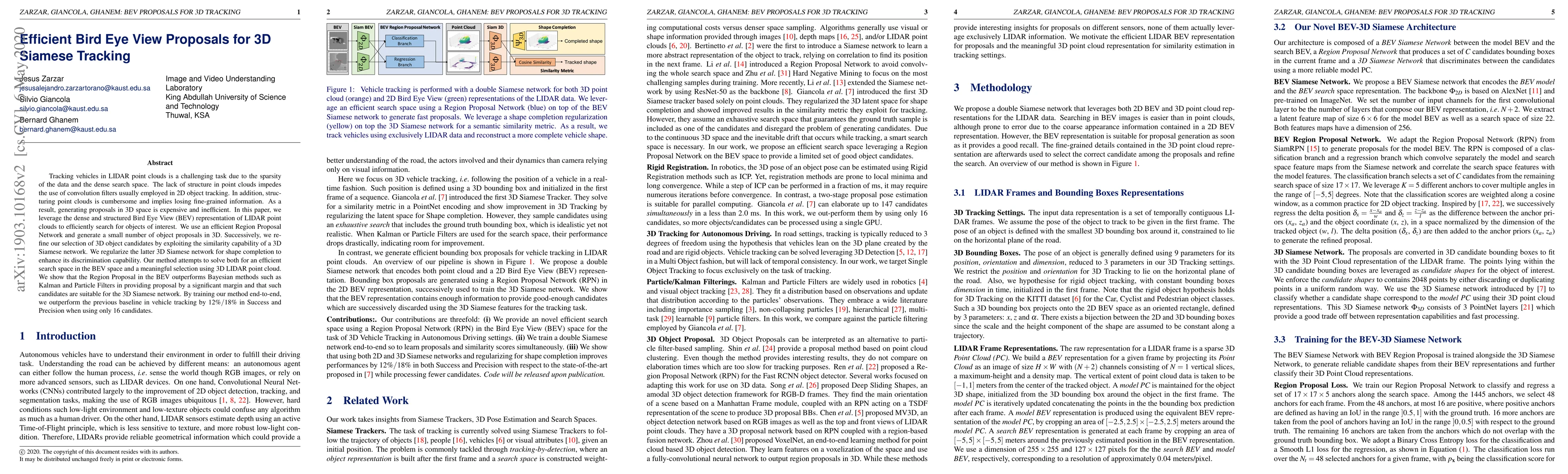 Tracking vehicles in LIDAR point clouds is a challenging task due to the sparsity of the data and the dense search space. The lack of structure in point clouds impedes the use of convolution filters usually employed in 2D object tracking. In addition, structuring point clouds is cumbersome and implies losing fine-grained information. As a result, generating proposals in 3D space is expensive and inefficient. In this paper, we leverage the dense and structured Bird Eye View (BEV) representation of LIDAR point clouds to efficiently search for objects of interest. We use an efficient Region Proposal Network and generate a small number of object proposals in 3D. Successively, we refine our selection of 3D object candidates by exploiting the similarity capability of a 3D Siamese network. We regularize the latter 3D Siamese network for shape completion to enhance its discrimination capability. Our method attempts to solve both for an efficient search space in the BEV space and a meaningful selection using 3D LIDAR point cloud. We show that the Region Proposal in the BEV outperforms Bayesian methods such as Kalman and Particle Filters in providing proposal by a significant margin and that such candidates are suitable for the 3D Siamese network. By training our method end-to-end, we outperform the previous baseline in vehicle tracking by 12% / 18% in Success and Precision when using only 16 candidates.