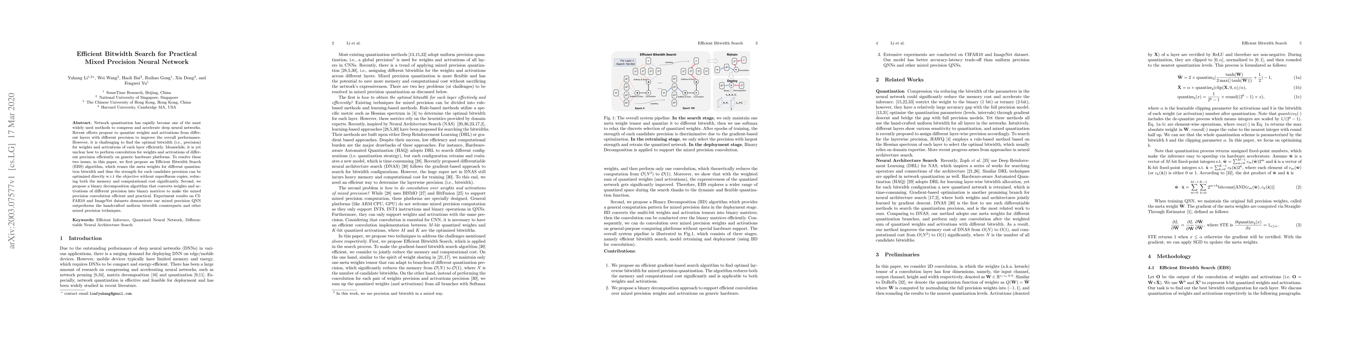This paper proposes an Efficient Bitwidth Search (EBS) algorithm to optimize the precision of weights and activations in neural networks, reducing memory and computational costs. It also introduces a binary decomposition method for efficient mixed precision convolution, demonstrating superior performance on CIFAR10 and ImageNet datasets compared to uniform bitwidth and other mixed precision techniques.