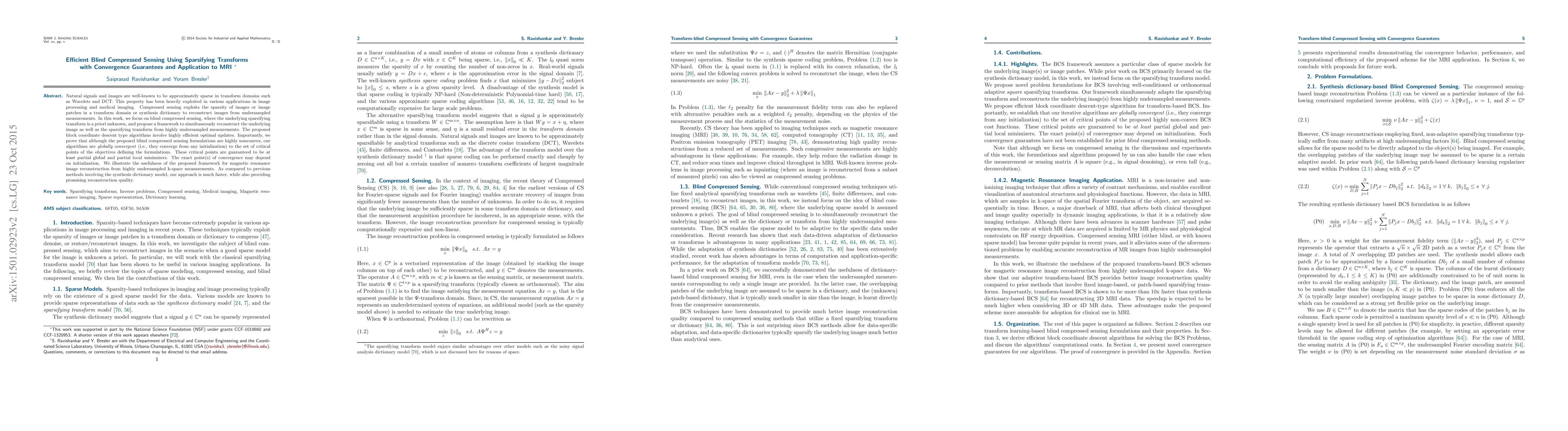 The research proposes a framework for blind compressed sensing that simultaneously reconstructs an image and its unknown sparsifying transform from highly undersampled measurements, using block coordinate descent type algorithms with optimal updates.