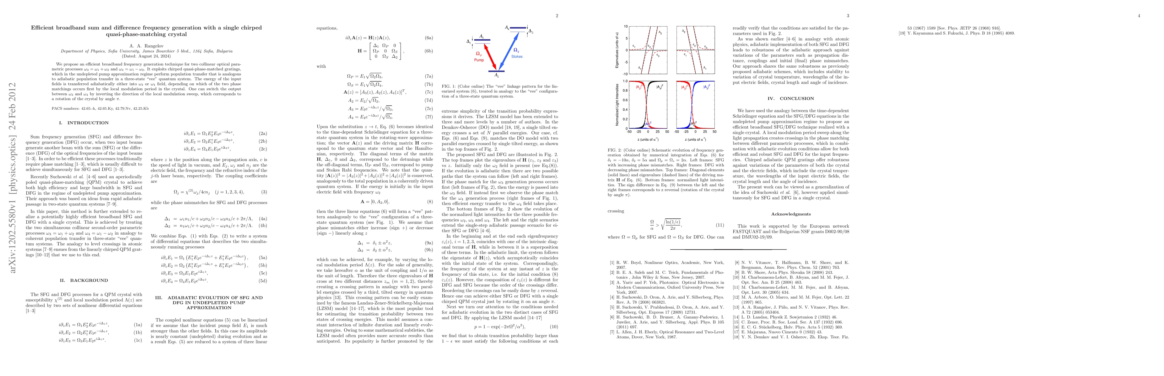 This paper proposes an efficient broadband frequency generation method using chirped quasi-phase-matching crystals for sum and difference frequency generation. The technique leverages population transfer analogous to adiabatic quantum systems to achieve optimal energy transfer between generated frequencies.