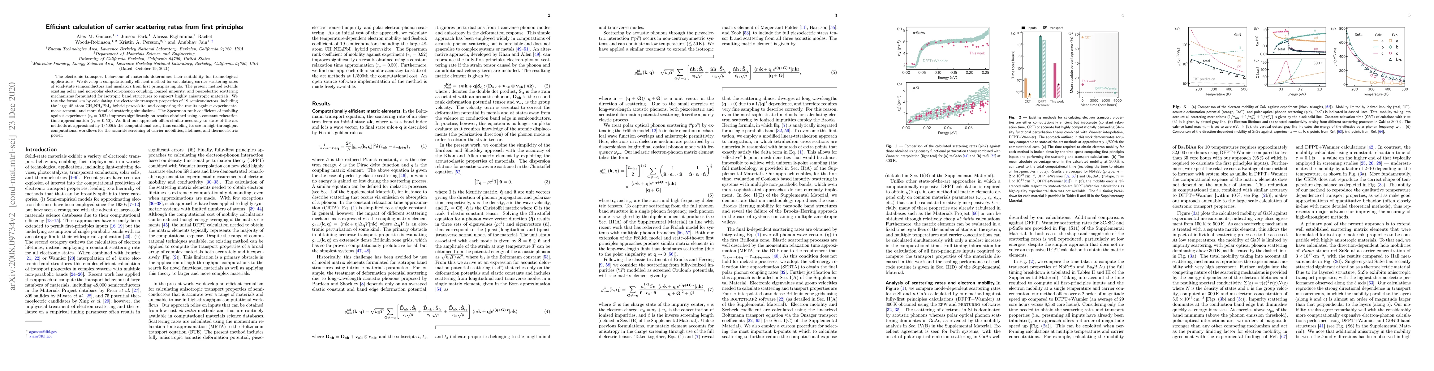 The electronic transport behaviour of materials determines their suitability for technological applications. We develop an efficient method for calculating carrier scattering rates of solid-state semiconductors and insulators from first principles inputs. The present method extends existing polar and non-polar electron-phonon coupling, ionized impurity, and piezoelectric scattering mechanisms formulated for isotropic band structures to support highly anisotropic materials. We test the formalism by calculating the electronic transport properties of 16 semiconductors and comparing the results against experimental measurements. The present work is amenable for use in high-throughput computational workflows and enables accurate screening of carrier mobilities, lifetimes, and thermoelectric power.