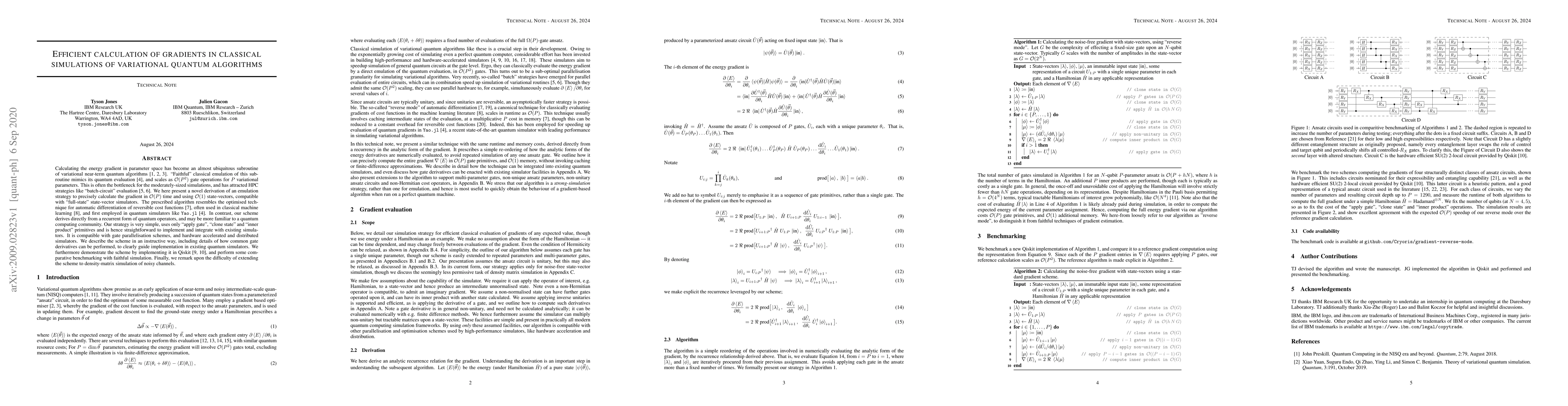 Calculating the energy gradient in parameter space has become an almost ubiquitous subroutine of variational near-term quantum algorithms. "Faithful" classical emulation of this subroutine mimics its quantum evaluation, and scales as O(P^2) gate operations for P variational parameters. This is often the bottleneck for the moderately-sized simulations, and has attracted HPC strategies like "batch-circuit" evaluation. We here present a novel derivation of an emulation strategy to precisely calculate the gradient in O(P) time and using O(1) state-vectors, compatible with "full-state" state-vector simulators. The prescribed algorithm resembles the optimised technique for automatic differentiation of reversible cost functions, often used in classical machine learning, and first employed in quantum simulators like Yao.jl. In contrast, our scheme derives directly from a recurrent form of quantum operators, and may be more familiar to a quantum computing community. Our strategy is very simple, uses only 'apply gate', 'clone state' and 'inner product' primitives and is hence straightforward to implement and integrate with existing simulators. It is compatible with gate parallelisation schemes, and hardware accelerated and distributed simulators. We describe the scheme in an instructive way, including details of how common gate derivatives can be performed, to clearly guide implementation in existing quantum simulators. We furthermore demonstrate the scheme by implementing it in Qiskit, and perform some comparative benchmarking with faithful simulation. Finally, we remark upon the difficulty of extending the scheme to density-matrix simulation of noisy channels.