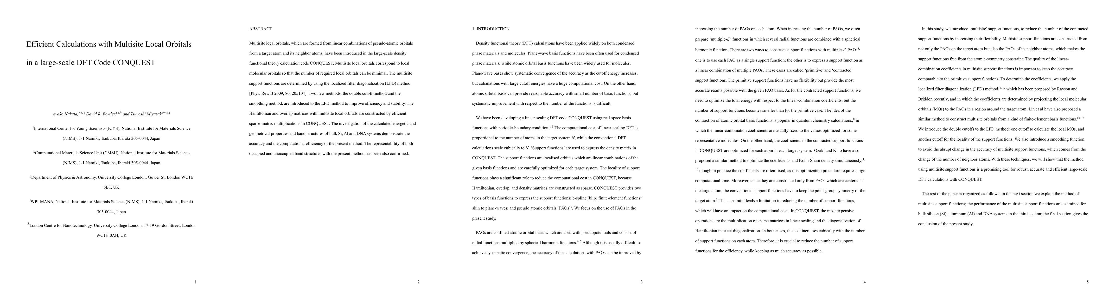 This paper introduces multisite local orbitals in the CONQUEST DFT code to minimize the number of local orbitals needed, enhancing computational efficiency. The localized filter diagonalization method, supplemented by new double cutoff and smoothing techniques, is used to construct Hamiltonian and overlap matrices efficiently, demonstrating accuracy and efficiency in calculations for bulk Si, Al, and DNA systems.