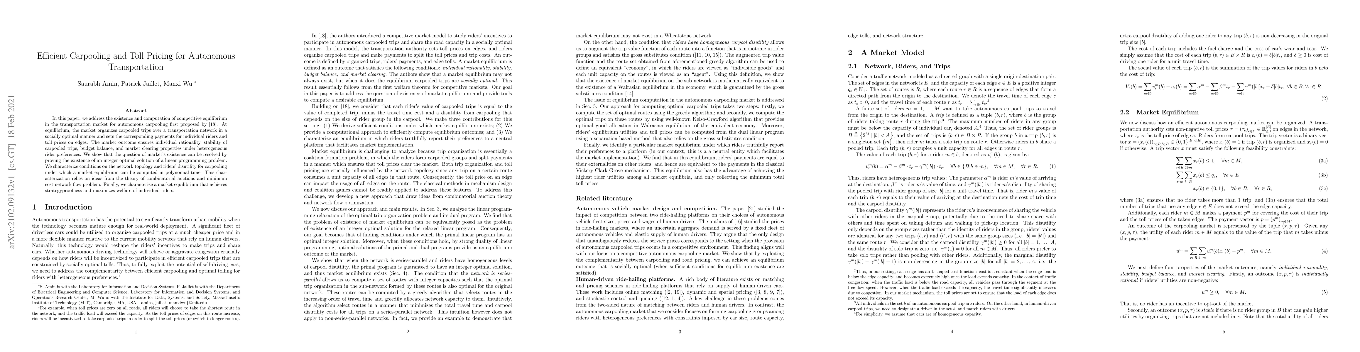 Researchers developed a framework to optimize carpooling and toll pricing for autonomous transportation, ensuring individual rationality and social optimality in the marketplace. Their findings provide insights into how network topology and rider preferences affect market equilibrium and welfare outcomes.