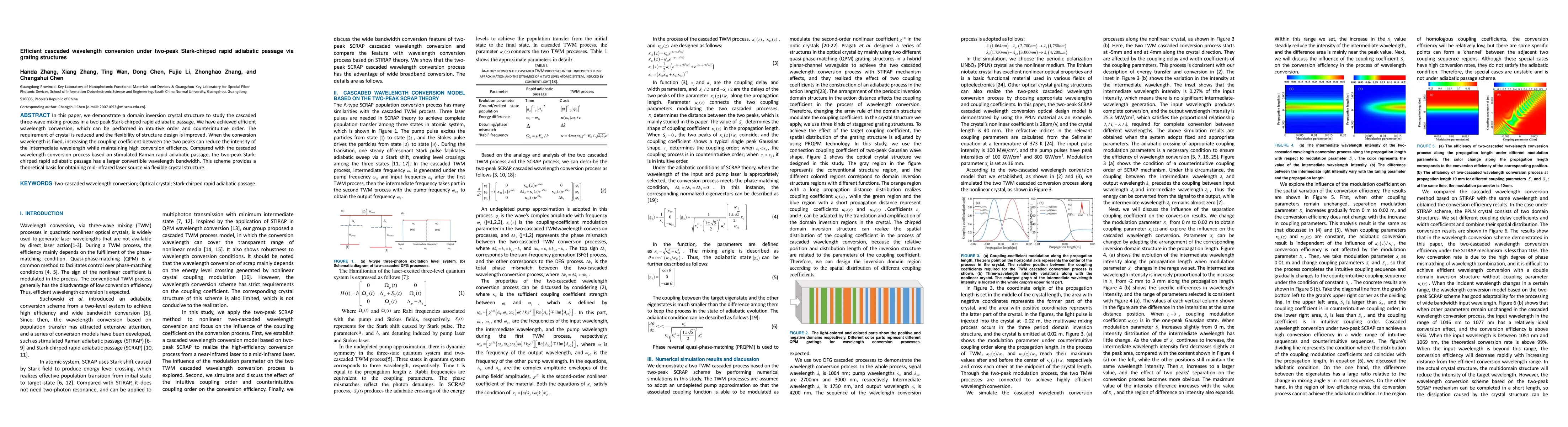 This paper presents a domain inversion crystal structure for efficient cascaded wavelength conversion using a two-peak Stark-chirped rapid adiabatic passage. It demonstrates high conversion efficiency with reduced crystal requirements and enhanced flexibility in structure design, offering a larger convertible wavelength bandwidth compared to stimulated Raman rapid adiabatic passage.