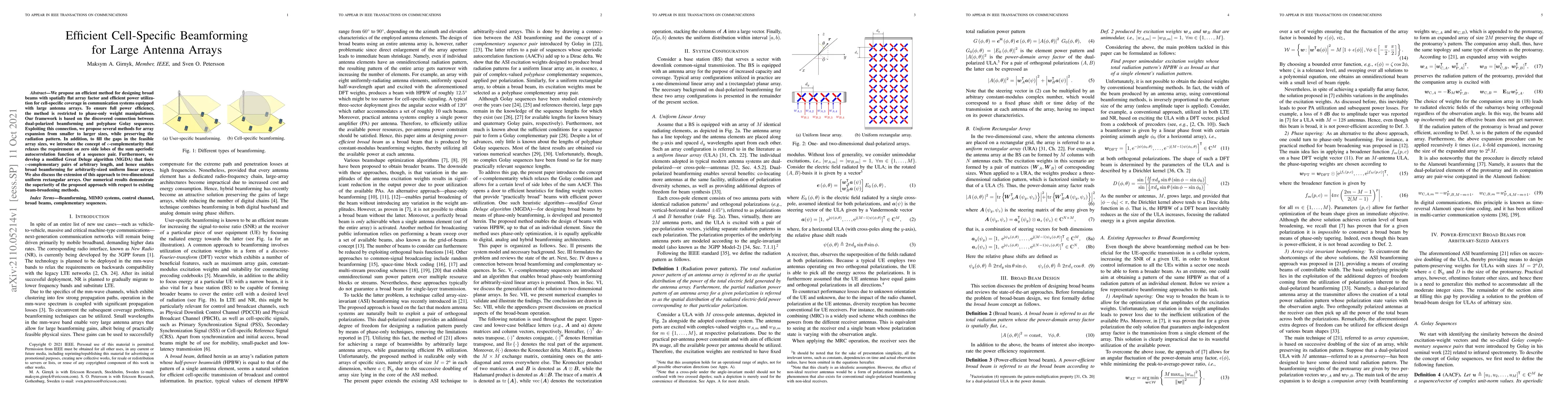 We propose an efficient method for designing broad beams with spatially flat array factor and efficient power utilization for cell-specific coverage in communication systems equipped with large antenna arrays. To ensure full power efficiency, the method is restricted to phase-only weight manipulations. Our framework is based on the discovered connection between dual-polarized beamforming and polyphase Golay sequences. Exploiting this connection, we propose several methods for array expansion from smaller to larger sizes, while preserving the radiation pattern. In addition, to fill the gaps in the feasible array sizes, we introduce the concept of $\epsilon$-complementarity that relaxes the requirement on zero side lobes of the sum aperiodic autocorrelation function of a sequence pair. Furthermore, we develop a modified Great Deluge algorithm (MGDA) that finds $\epsilon$-complementary pairs of arbitrary length, and hence enables broad beamforming for arbitrarily-sized uniform linear arrays. We also discuss the extension of this approach to two-dimensional uniform rectangular arrays. Our numerical results demonstrate the superiority of the proposed approach with respect to existing beam-broadening methods.