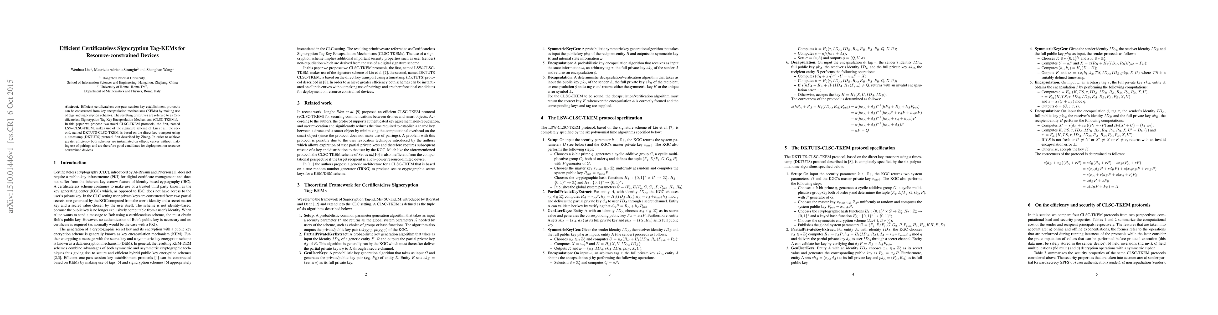 The paper proposes two novel Certificateless Signcryption Tag Key Encapsulation Mechanisms (CLSC-TKEMs), LSW-CLSC-TKEM and DKTUTS-CLSC-TKEM, both instantiated on elliptic curves without using pairings for efficiency on resource-constrained devices.