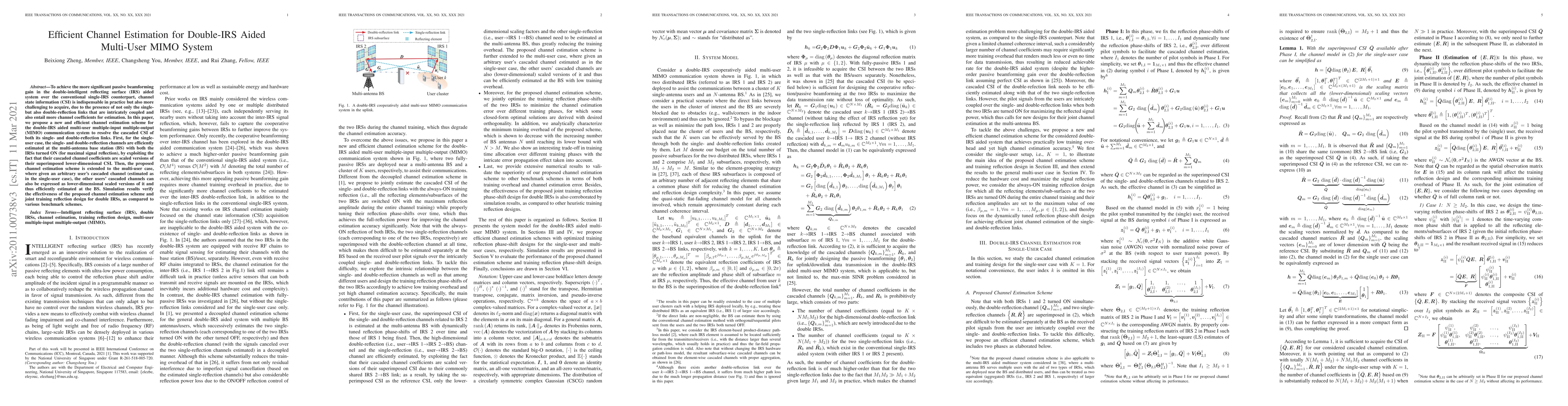 This paper proposes an efficient channel estimation scheme for double-intelligent reflecting surface (IRS) aided multi-user MIMO systems to address the complexity of estimating cascaded CSI for single- and double-reflection links. The method efficiently estimates channels at the base station by leveraging scaled versions of lower-dimensional CSI, validated through simulations.