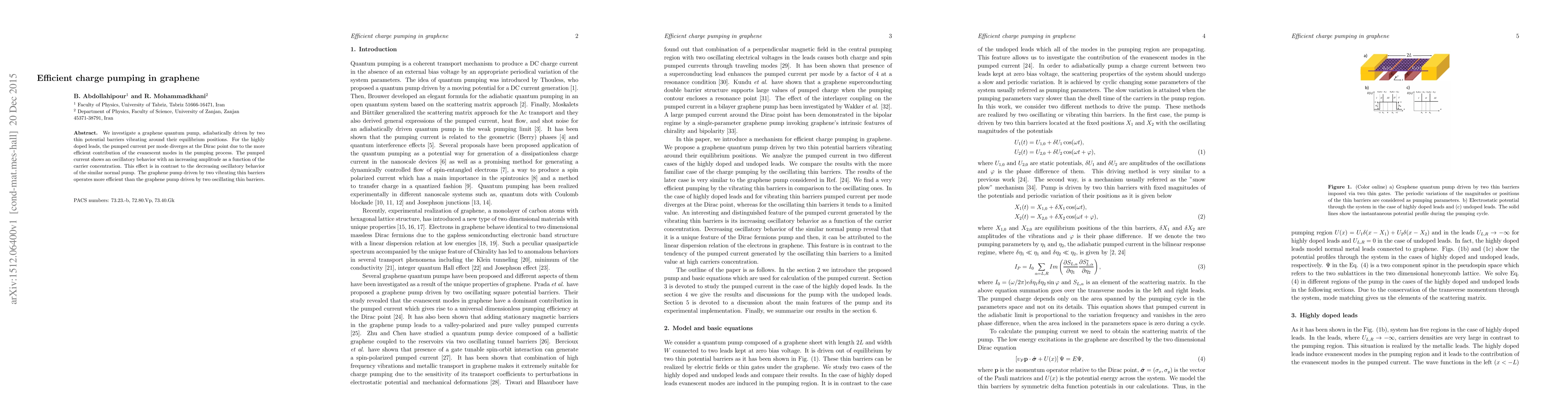 We investigate a graphene quantum pump, adiabatically driven by two thin potential barriers vibrating around their equilibrium positions. For the highly doped leads, the pumped current per mode diverges at the Dirac point due to the more efficient contribution of the evanescent modes in the pumping process. The pumped current shows an oscillatory behavior with an increasing amplitude as a function of the carrier concentration. This effect is in contrast to the decreasing oscillatory behavior of the similar normal pump. The graphene pump driven by two vibrating thin barriers operates more efficient than the graphene pump driven by two oscillating thin barriers.