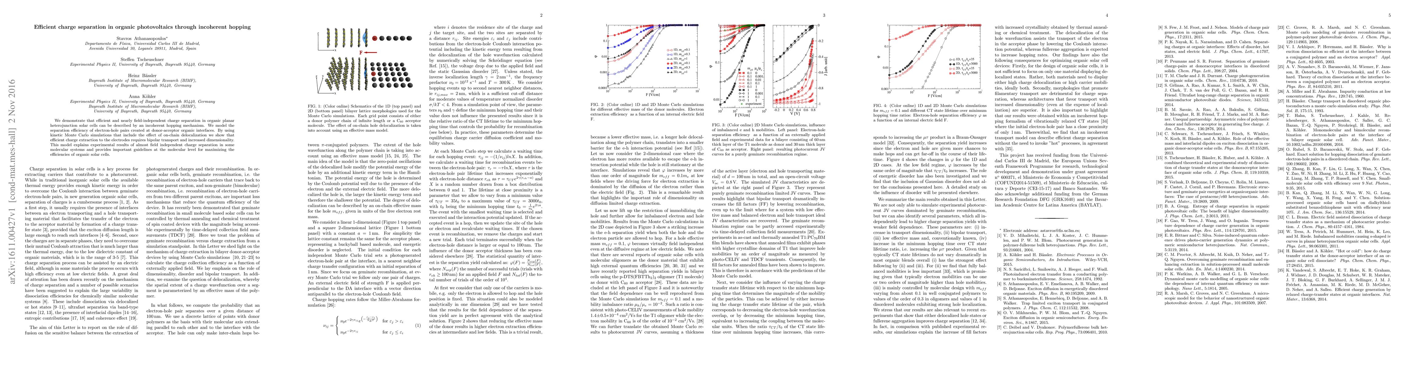 The research shows that efficient charge separation in organic photovoltaics can be achieved via an incoherent hopping mechanism, as demonstrated by kinetic Monte Carlo simulations that highlight the role of bipolar transport and increased dimensionality for optimal charge extraction. This model explains experimental observations and offers molecular-level insights for enhancing organic solar cell efficiencies.