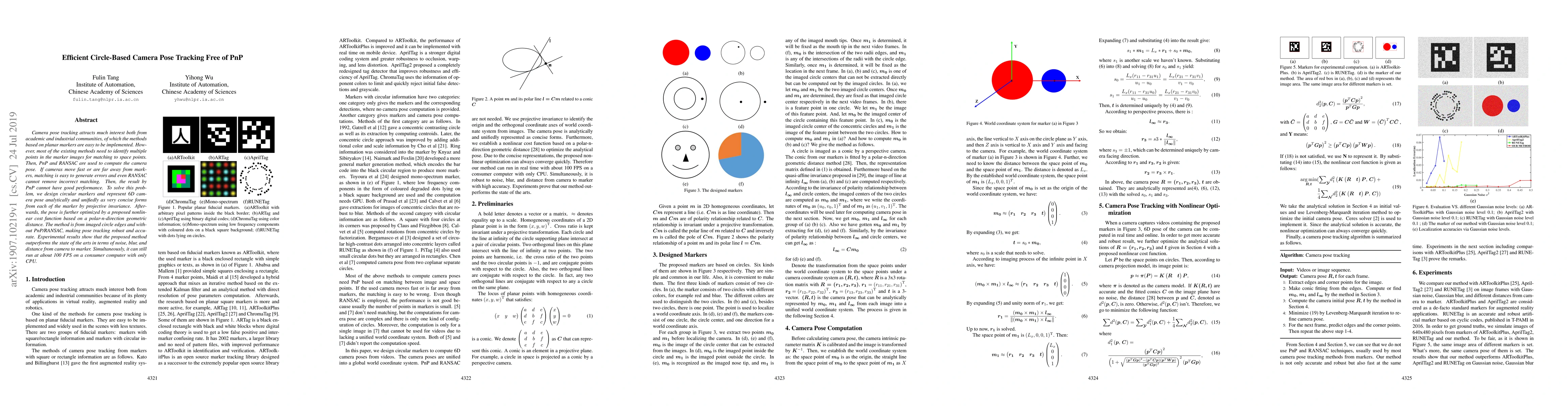 A new method for efficient circle-based camera pose tracking is proposed, which overcomes limitations of existing methods by using circular markers and a nonlinear cost function to optimize the pose, achieving robust and accurate results with high frame rates.