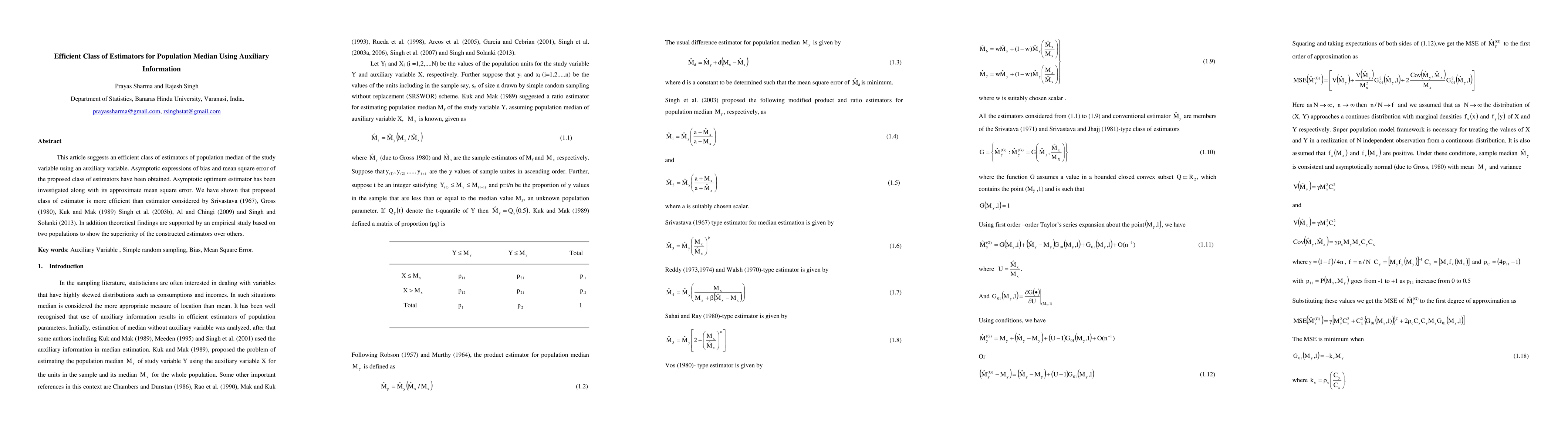 This paper proposes an efficient class of estimators for the population median using auxiliary information, demonstrating improved efficiency over previous methods through asymptotic analysis and empirical study. The proposed estimators outperform earlier techniques by minimizing bias and mean square error.