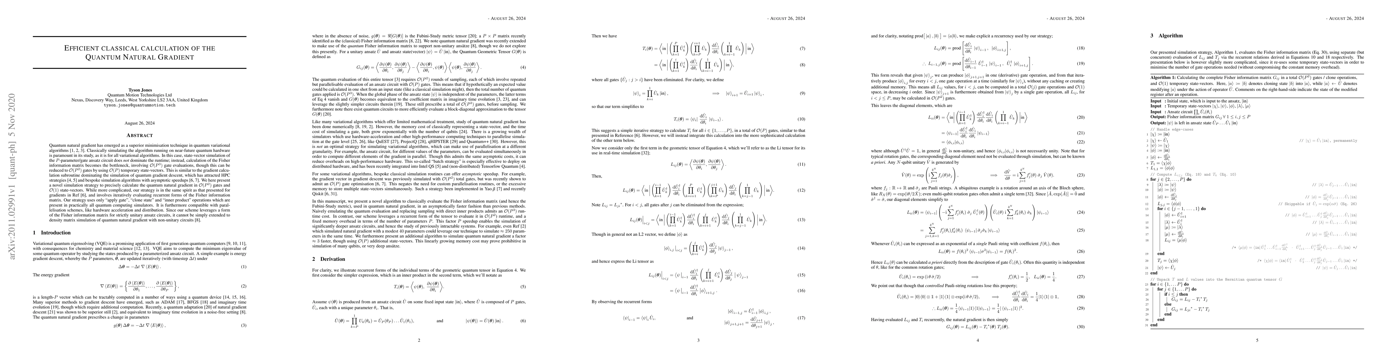 This paper presents a novel simulation strategy to efficiently compute the quantum natural gradient in O(P^2) gates and O(1) state-vectors, overcoming the O(P^3) gate bottleneck. It leverages iterative evaluation of recurrent forms of the Fisher information matrix and is compatible with parallelization schemes.