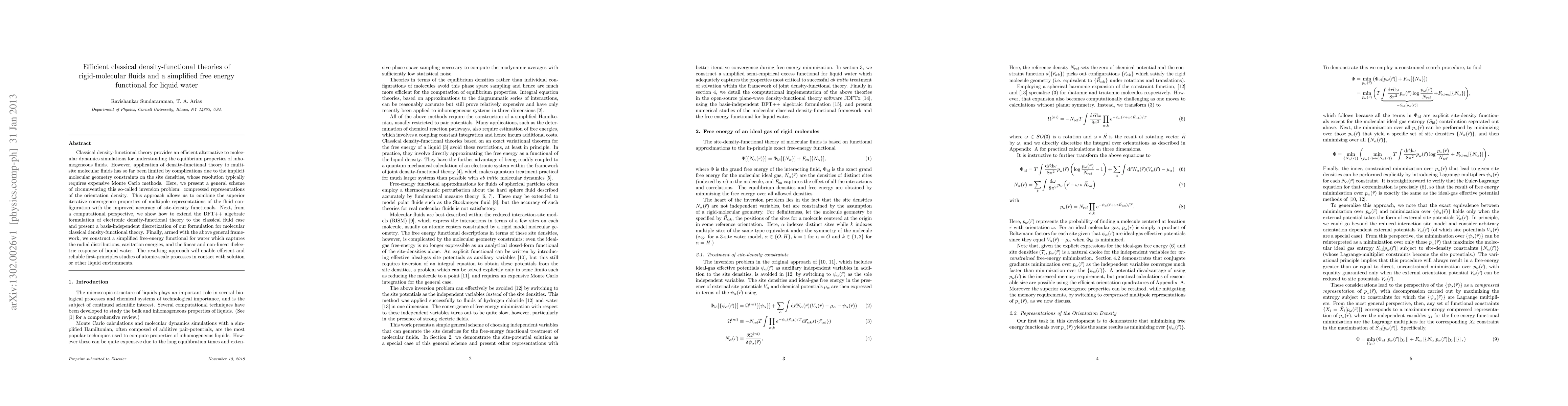 This paper introduces an efficient classical density-functional theory for rigid-molecular fluids, overcoming the inversion problem through compressed orientation density representations. It also develops a simplified free-energy functional for liquid water, enabling reliable first-principles studies of atomic-scale processes in liquid environments.