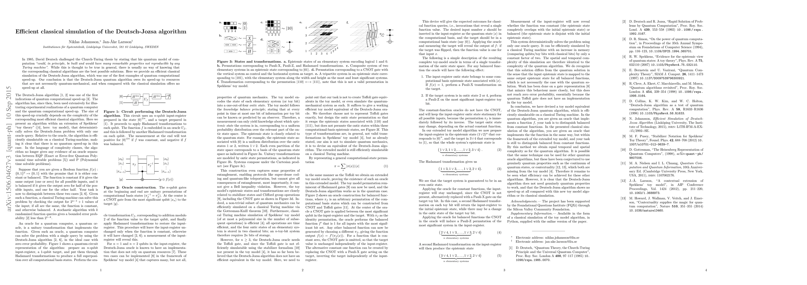 In 1985, David Deutsch challenged the Church-Turing thesis by stating that his quantum model of computation "could, in principle, be built and would have many remarkable properties not reproducible by any Turing machine". While this is thought to be true in general, there is usually no way of knowing that the corresponding classical algorithms are the best possible solutions. Here we provide an efficient classical simulation of the Deutsch-Jozsa algorithm, which was one of the first examples of quantum computational speed-up. Our conclusion is that the Deutsch-Jozsa quantum algorithm owes its speed-up to resources that are not necessarily quantum-mechanical, and when compared with the classical simulation offers no speed-up at all.