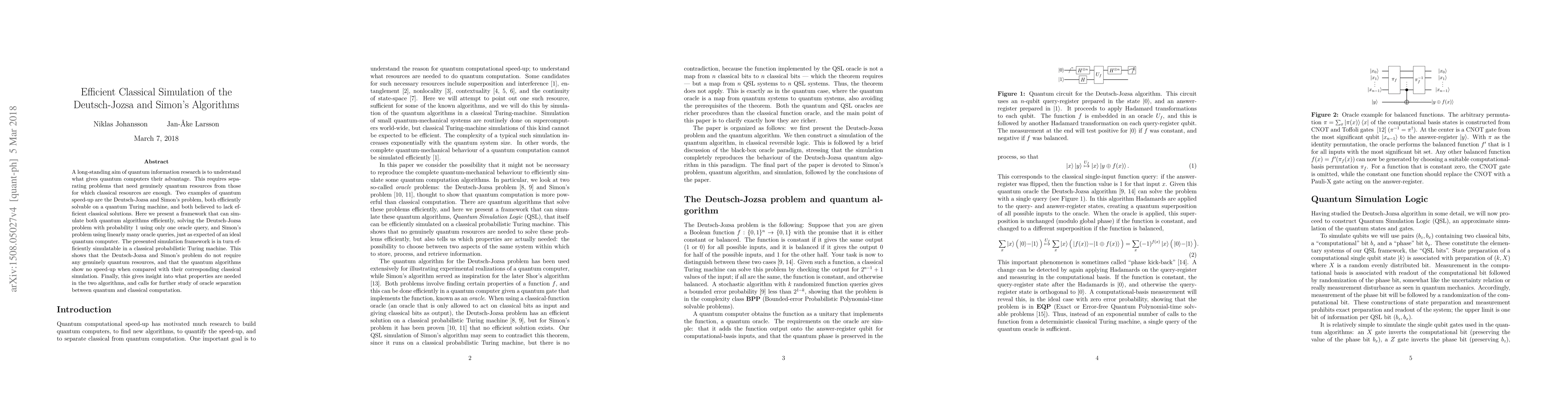 A long-standing aim of quantum information research is to understand what gives quantum computers their advantage. This requires separating problems that need genuinely quantum resources from those for which classical resources are enough. Two examples of quantum speed-up are the Deutsch-Jozsa and Simon's problem, both efficiently solvable on a quantum Turing machine, and both believed to lack efficient classical solutions. Here we present a framework that can simulate both quantum algorithms efficiently, solving the Deutsch-Jozsa problem with probability 1 using only one oracle query, and Simon's problem using linearly many oracle queries, just as expected of an ideal quantum computer. The presented simulation framework is in turn efficiently simulatable in a classical probabilistic Turing machine. This shows that the Deutsch-Jozsa and Simon's problem do not require any genuinely quantum resources, and that the quantum algorithms show no speed-up when compared with their corresponding classical simulation. Finally, this gives insight into what properties are needed in the two algorithms, and calls for further study of oracle separation between quantum and classical computation.