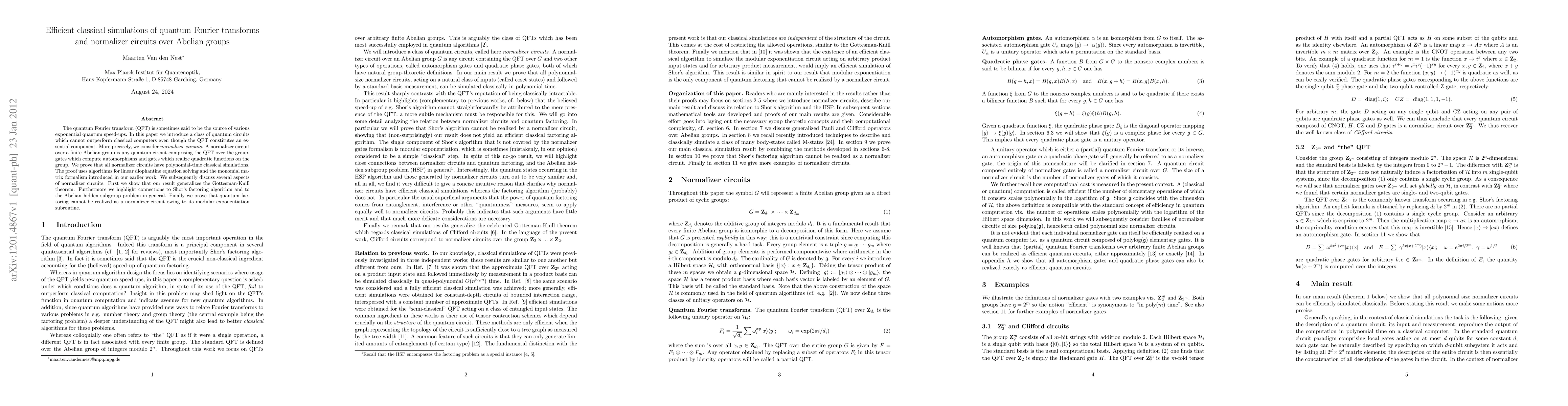 This paper demonstrates that quantum Fourier transforms (QFT) within normalizer circuits over Abelian groups can be efficiently simulated classically, despite the QFT's role in quantum speed-ups. The authors prove that these circuits, which include QFTs, automorphism gates, and quadratic functions, can be classically simulated in polynomial time, thus negating their potential for quantum advantage.