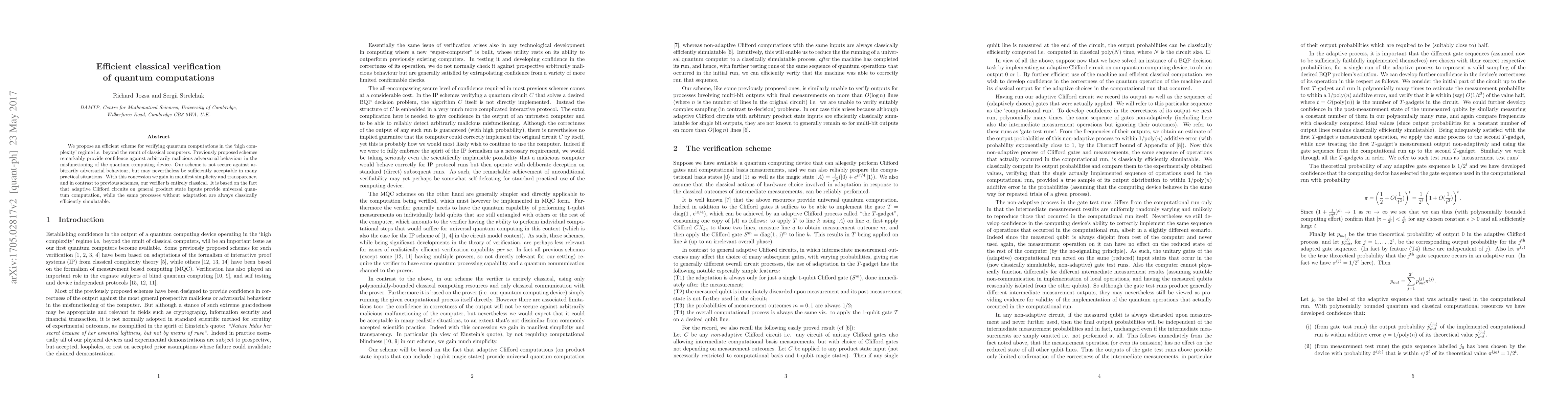 We propose an efficient scheme for verifying quantum computations in the `high complexity' regime i.e. beyond the remit of classical computers. Previously proposed schemes remarkably provide confidence against arbitrarily malicious adversarial behaviour in the misfunctioning of the quantum computing device. Our scheme is not secure against arbitrarily adversarial behaviour, but may nevertheless be sufficiently acceptable in many practical situations. With this concession we gain in manifest simplicity and transparency, and in contrast to previous schemes, our verifier is entirely classical. It is based on the fact that adaptive Clifford circuits on general product state inputs provide universal quantum computation, while the same processes without adaptation are always classically efficiently simulatable.