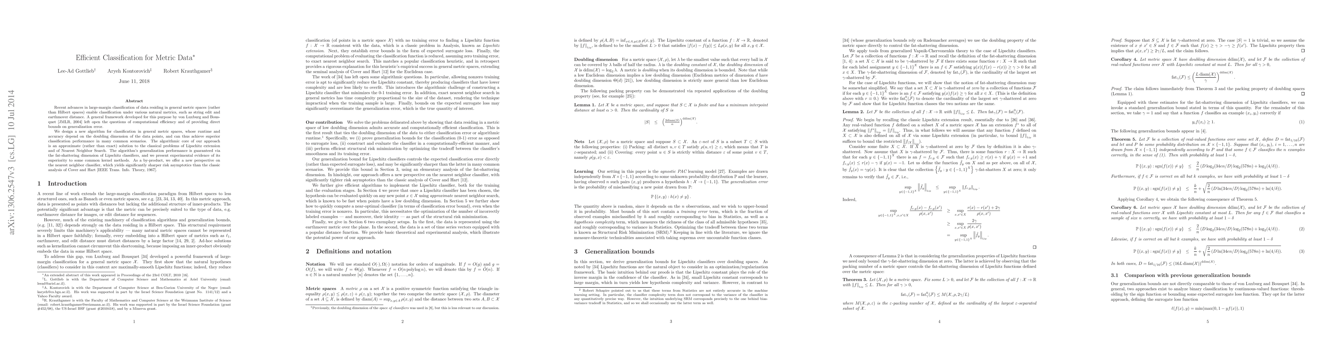 Recent advances in large-margin classification of data residing in general metric spaces (rather than Hilbert spaces) enable classification under various natural metrics, such as string edit and earthmover distance. A general framework developed for this purpose by von Luxburg and Bousquet [JMLR, 2004] left open the questions of computational efficiency and of providing direct bounds on generalization error. We design a new algorithm for classification in general metric spaces, whose runtime and accuracy depend on the doubling dimension of the data points, and can thus achieve superior classification performance in many common scenarios. The algorithmic core of our approach is an approximate (rather than exact) solution to the classical problems of Lipschitz extension and of Nearest Neighbor Search. The algorithm's generalization performance is guaranteed via the fat-shattering dimension of Lipschitz classifiers, and we present experimental evidence of its superiority to some common kernel methods. As a by-product, we offer a new perspective on the nearest neighbor classifier, which yields significantly sharper risk asymptotics than the classic analysis of Cover and Hart [IEEE Trans. Info. Theory, 1967].