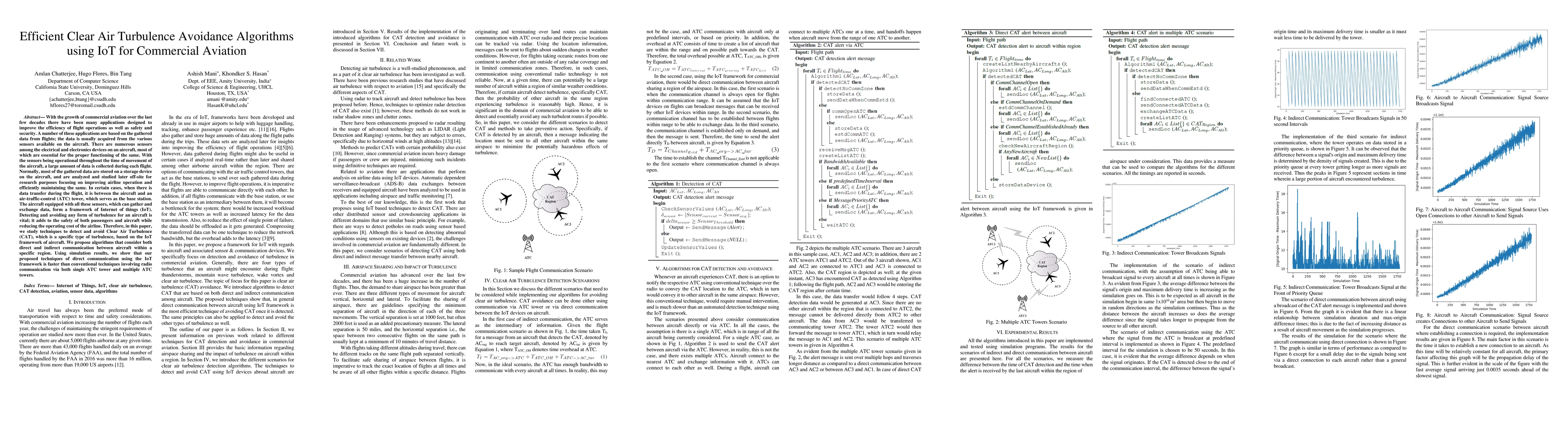 This research proposes IoT-based algorithms for efficient Clear Air Turbulence (CAT) detection and avoidance in commercial aviation, demonstrating through simulations that direct aircraft communication within an IoT framework is faster than conventional radio communication via ATC towers.