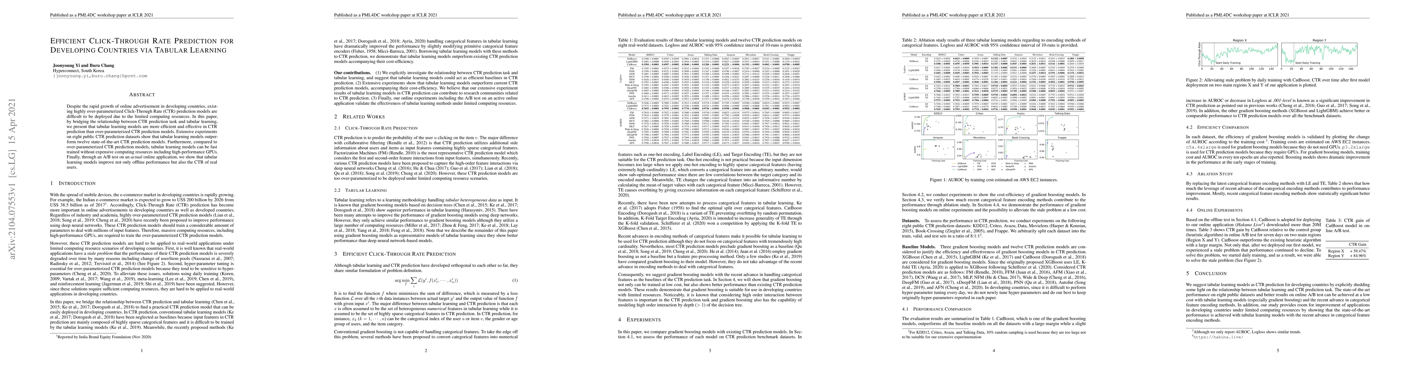 The paper bridges the gap between CTR prediction and tabular learning, proposing efficient tabular learning models for CTR prediction tasks in developing countries.