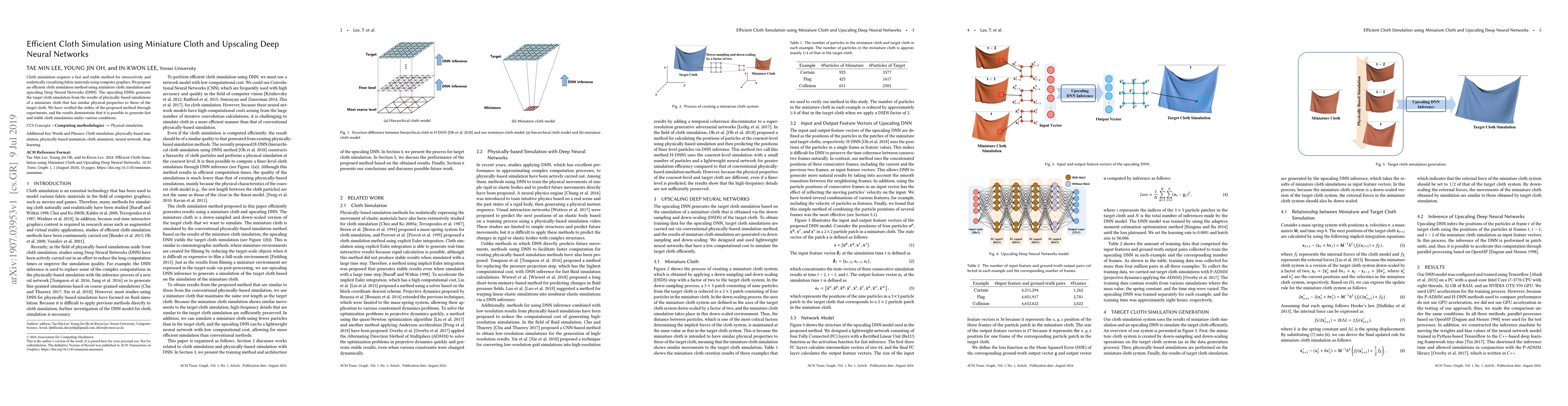 This paper proposes an efficient cloth simulation method that uses miniature cloth simulations upscaled by Deep Neural Networks (DNNs) to achieve fast and stable results. Experiments show that the method can generate realistic cloth simulations under various conditions.