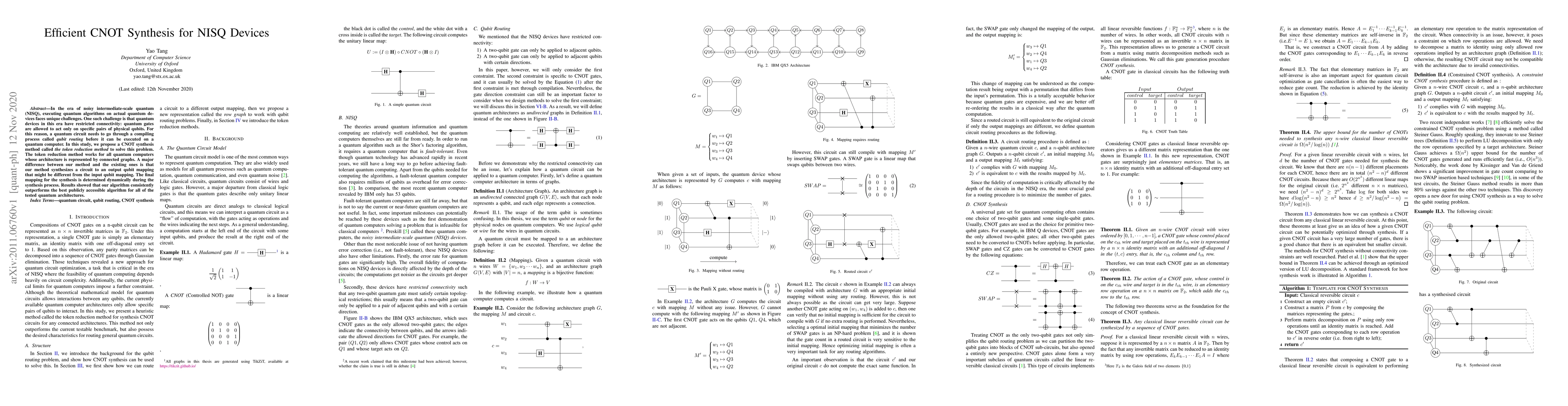 This study proposes a novel CNOT synthesis method called the token reduction method to address the connectivity challenges in NISQ devices. Unlike existing methods, it dynamically determines an output qubit mapping during synthesis, consistently outperforming the best publicly accessible algorithms across tested architectures.