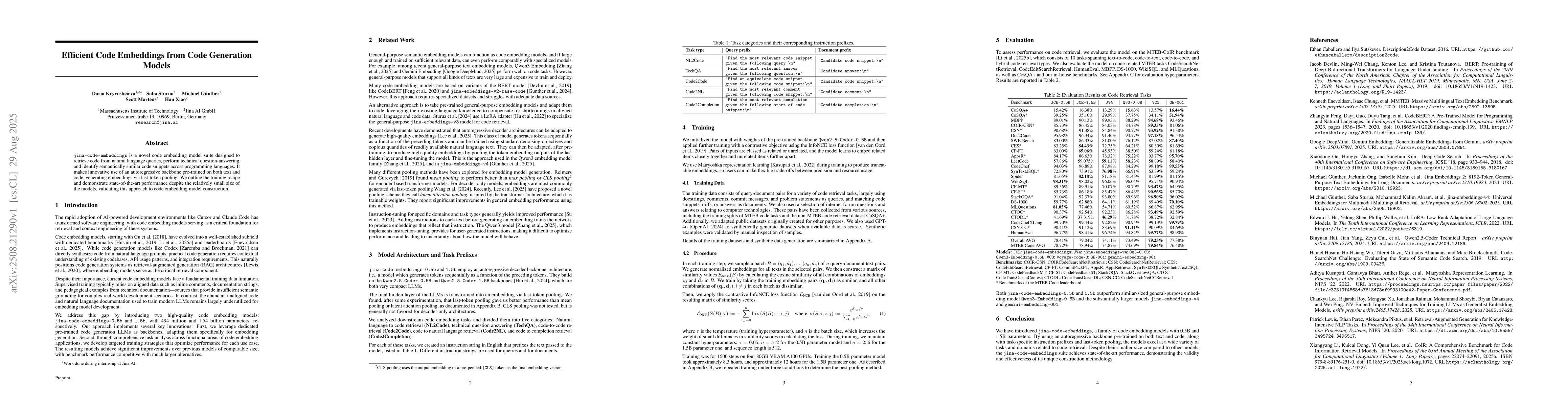 jina-code-embeddings is a novel code embedding model suite designed to retrieve code from natural language queries, perform technical question-answering, and identify semantically similar code snippets across programming languages. It makes innovative use of an autoregressive backbone pre-trained on both text and code, generating embeddings via last-token pooling. We outline the training recipe and demonstrate state-of-the-art performance despite the relatively small size of the models, validating this approach to code embedding model construction.