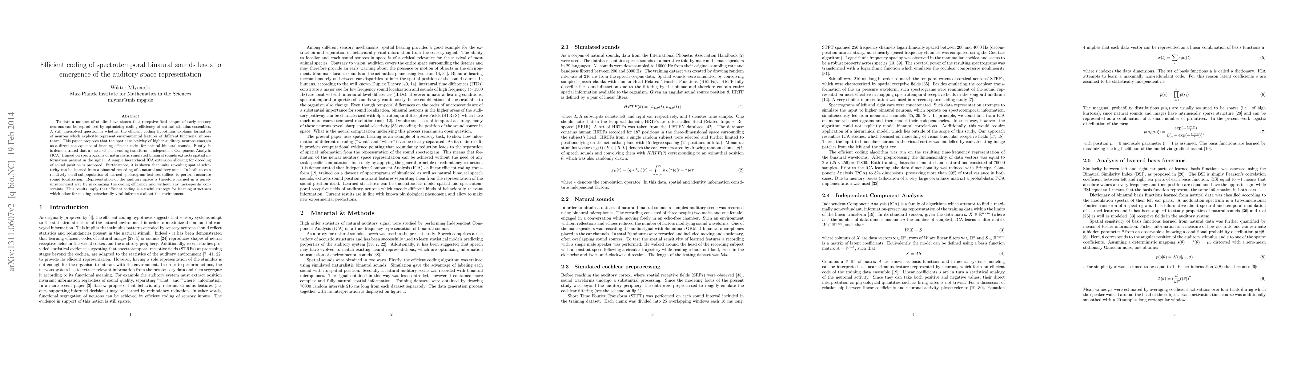 This paper demonstrates that spatial selectivity in higher auditory neurons emerges from learning efficient codes for natural binaural sounds, showing that spatial information can be extracted using Independent Component Analysis (ICA) and that sound localization can be achieved with a small subpopulation of learned features. The findings suggest efficient coding as a strategy for learning environmental features crucial for behavior.