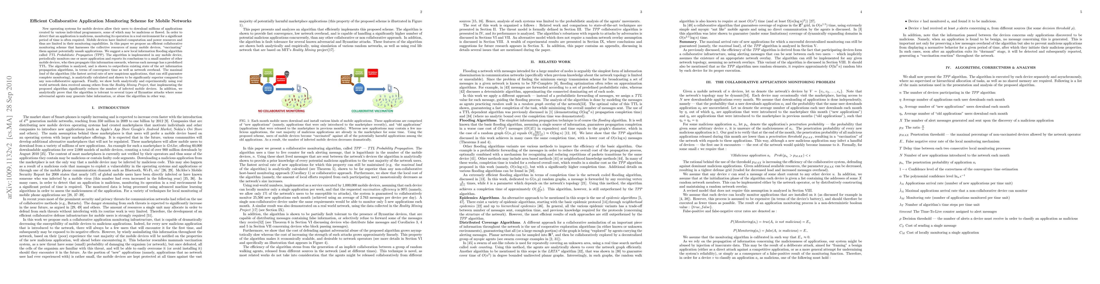 New operating systems for mobile devices allow their users to download millions of applications created by various individual programmers, some of which may be malicious or flawed. In order to detect that an application is malicious, monitoring its operation in a real environment for a significant period of time is often required. Mobile devices have limited computation and power resources and thus are limited in their monitoring capabilities. In this paper we propose an efficient collaborative monitoring scheme that harnesses the collective resources of many mobile devices, "vaccinating" them against potentially unsafe applications. We suggest a new local information flooding algorithm called "TTL Probabilistic Propagation" (TPP). The algorithm periodically monitors one or more application and reports its conclusions to a small number of other mobile devices, who then propagate this information onwards. The algorithm is analyzed, and is shown to outperform existing state of the art information propagation algorithms, in terms of convergence time as well as network overhead. The maximal "load" of the algorithm (the fastest arrival rate of new suspicious applications, that can still guarantee complete monitoring), is analytically calculated and shown to be significantly superior compared to any non-collaborative approach. Finally, we show both analytically and experimentally using real world network data that implementing the proposed algorithm significantly reduces the number of infected mobile devices. In addition, we analytically prove that the algorithm is tolerant to several types of Byzantine attacks where some adversarial agents may generate false information, or abuse the algorithm in other ways.
