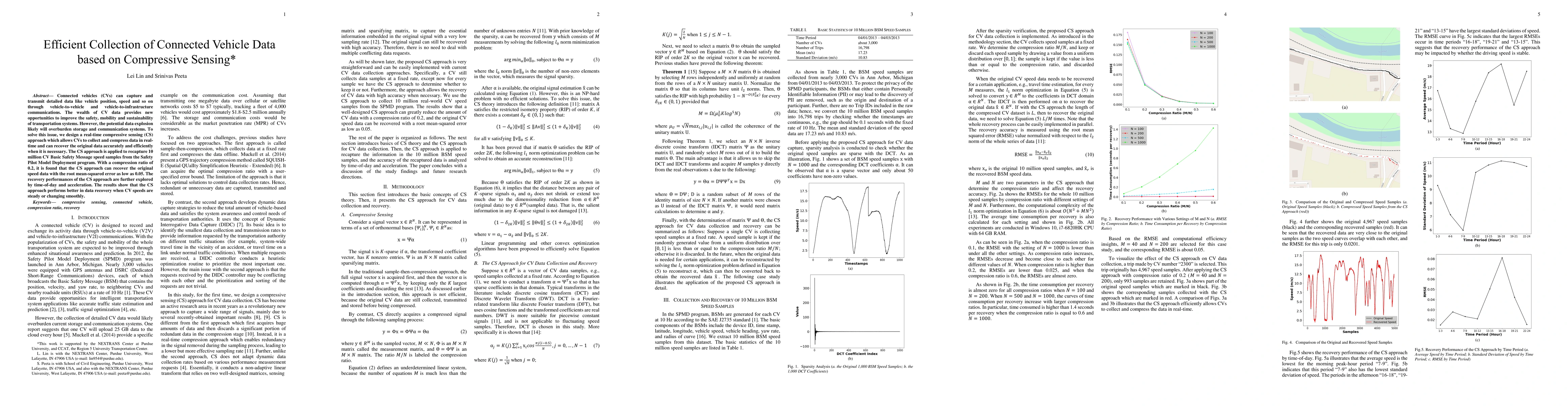 This paper proposes a real-time compressive sensing approach to efficiently collect and compress connected vehicle data, addressing the challenge of data overload. The method accurately recovers original speed data with minimal error and performs better under steady or smoothly changing vehicle speeds.