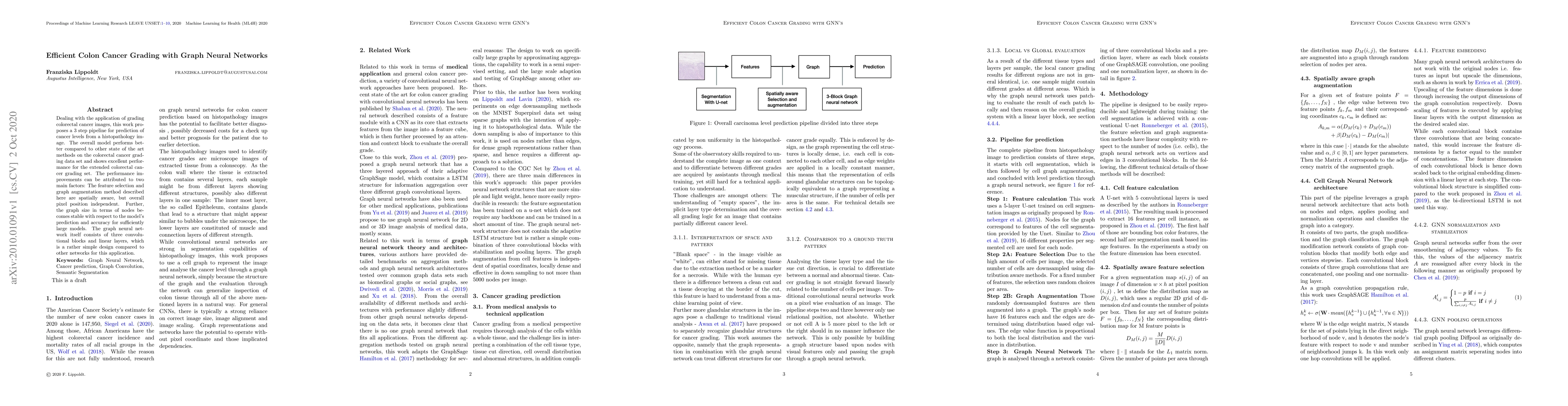 This paper proposes a graph neural network for efficient colon cancer grading from histopathology images, achieving superior performance compared to state-of-the-art methods. The model's success is attributed to spatially aware feature selection and graph augmentation, along with stable graph size for large models.