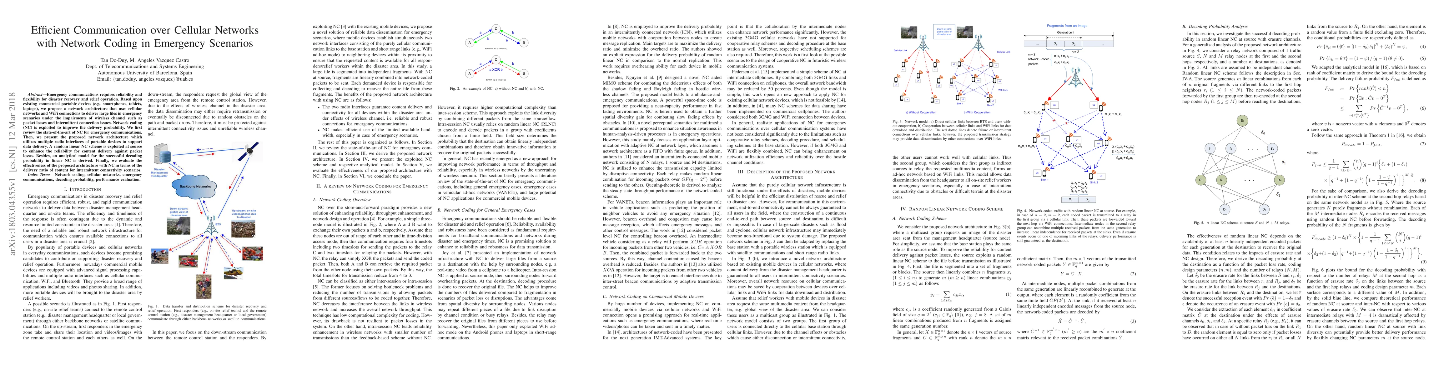 This paper proposes a network architecture using network coding over cellular and WiFi networks to enhance emergency communication reliability. It employs a random linear network coding scheme to improve data delivery against packet losses and evaluates its effectiveness through an analytical model and delivery ratio analysis.