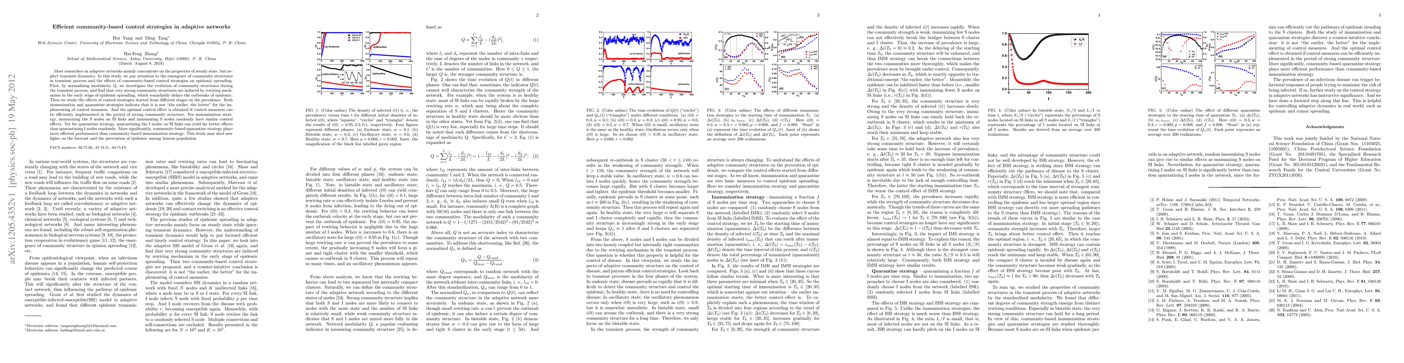 Most researches on adaptive networks mainly concentrate on the properties of steady state, but neglect transient dynamics. In this study, we pay attention to the emergence of community structures in transient process and the effects of community-based control strategies on epidemic spreading. First, by normalizing modularity $Q$, we investigate the evolution of community structures during the transient process, and find that very strong community structures are induced by rewiring mechanism in the early stage of epidemic spreading, which remarkably delays the outbreaks of epidemic. Then we study the effects of control strategies started from different stages on the prevalence. Both immunization and quarantine strategies indicate that it is not "the earlier, the better" for the implementing of control measures. And the optimal control effect is obtained if control measures can be efficiently implemented in the period of strong community structure. For immunization strategy, immunizing the S nodes on SI links and immunizing S nodes randomly have similar control effects. Yet for quarantine strategy, quarantining the I nodes on SI links can yield far better effects than quarantining I nodes randomly. More significantly, community-based quarantine strategy plays more efficient performance than community-based immunization strategy. This study may shed new lights on the forecast and the prevention of epidemic among human population.