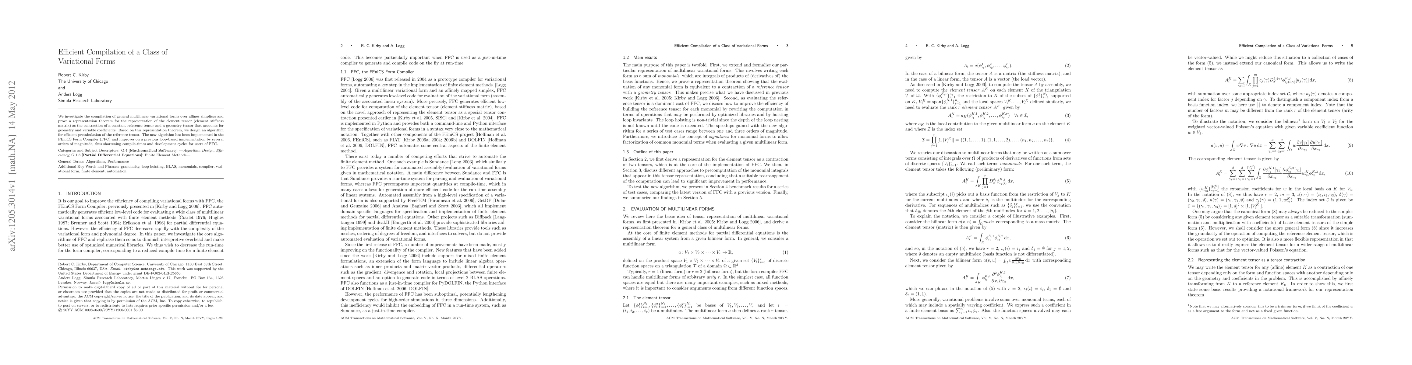 We investigate the compilation of general multilinear variational forms over affines simplices and prove a representation theorem for the representation of the element tensor (element stiffness matrix) as the contraction of a constant reference tensor and a geometry tensor that accounts for geometry and variable coefficients. Based on this representation theorem, we design an algorithm for efficient pretabulation of the reference tensor. The new algorithm has been implemented in the FEniCS Form Compiler (FFC) and improves on a previous loop-based implementation by several orders of magnitude, thus shortening compile-times and development cycles for users of FFC.