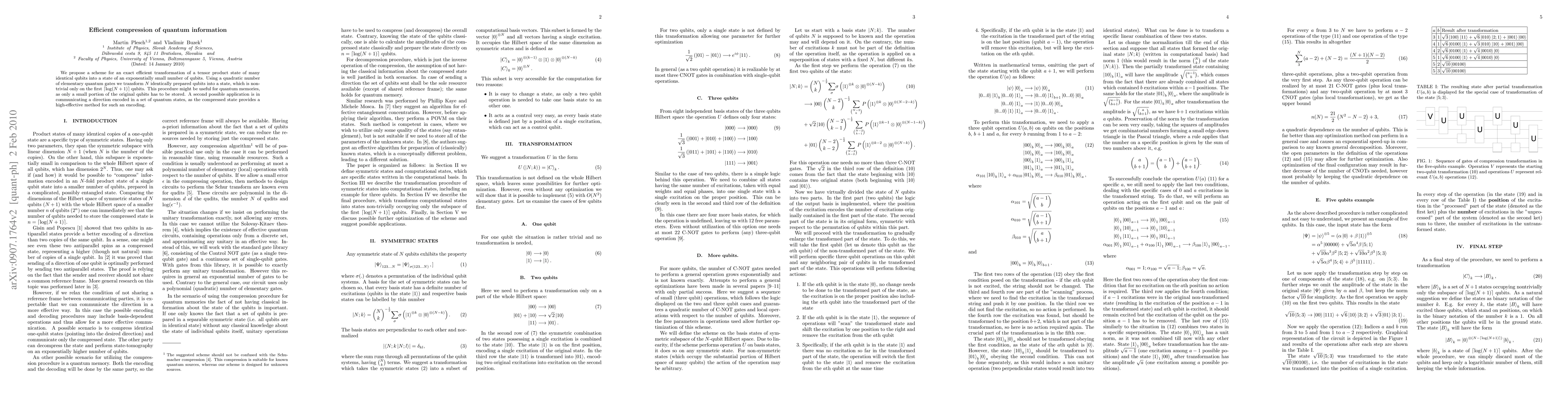 This paper proposes an efficient quantum compression scheme that transforms a tensor product state of many qubits into a compressed state requiring only a logarithmic number of qubits, using a quadratic number of quantum gates. This method could enhance quantum memory efficiency and enable effective encoding for communication of directions in quantum states.