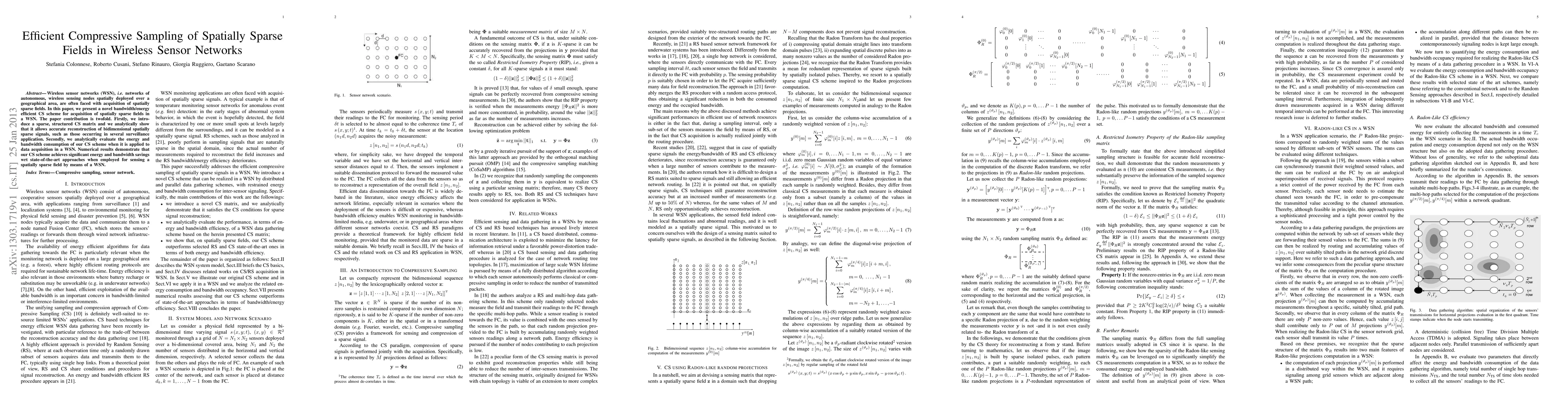 Wireless sensor networks (WSN), i.e. networks of autonomous, wireless sensing nodes spatially deployed over a geographical area, are often faced with acquisition of spatially sparse fields. In this paper, we present a novel bandwidth/energy efficient CS scheme for acquisition of spatially sparse fields in a WSN. The paper contribution is twofold. Firstly, we introduce a sparse, structured CS matrix and we analytically show that it allows accurate reconstruction of bidimensional spatially sparse signals, such as those occurring in several surveillance application. Secondly, we analytically evaluate the energy and bandwidth consumption of our CS scheme when it is applied to data acquisition in a WSN. Numerical results demonstrate that our CS scheme achieves significant energy and bandwidth savings wrt state-of-the-art approaches when employed for sensing a spatially sparse field by means of a WSN.