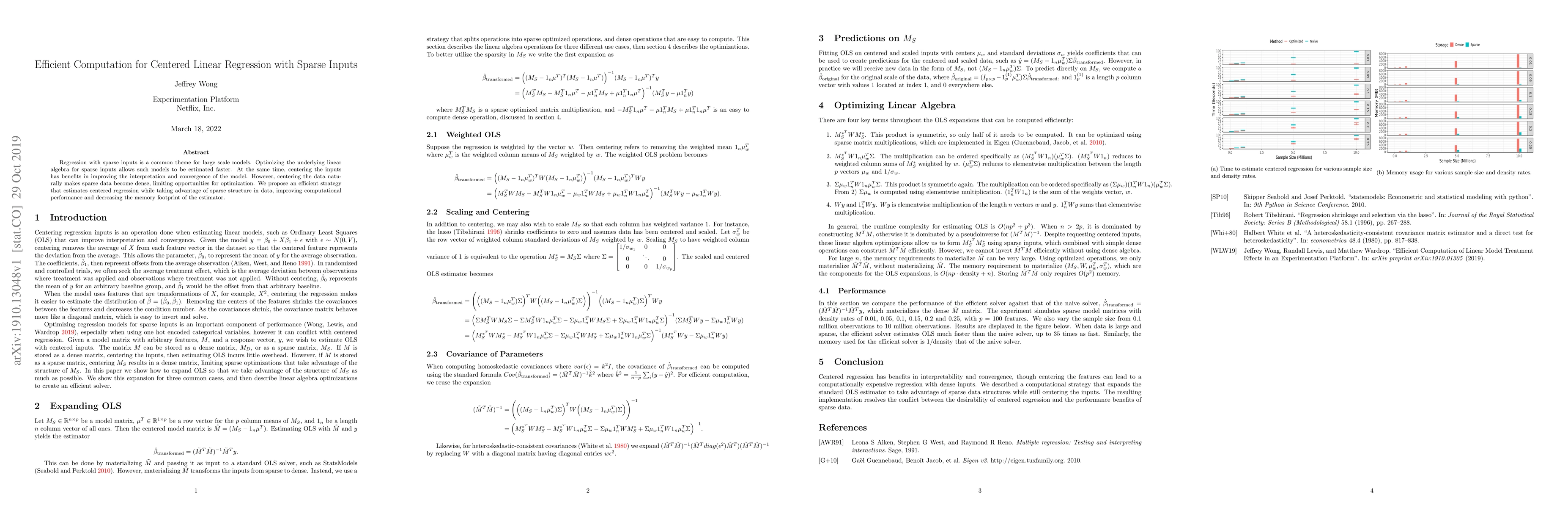 This paper proposes an efficient strategy for centered linear regression with sparse inputs, optimizing linear algebra to improve computational speed and reduce memory usage while maintaining the benefits of centering data. This method leverages the sparse structure to enhance performance without compromising the advantages of centering.