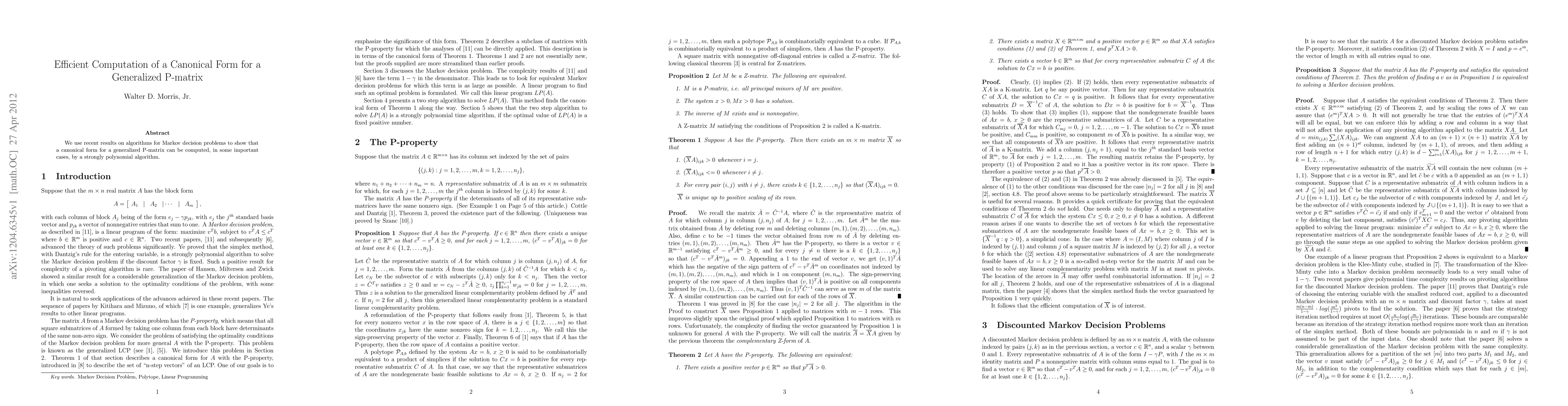 We use recent results on algorithms for Markov decision problems to show that a canonical form for a generalized P-matrix can be computed, in some important cases, by a strongly polynomial algorithm.